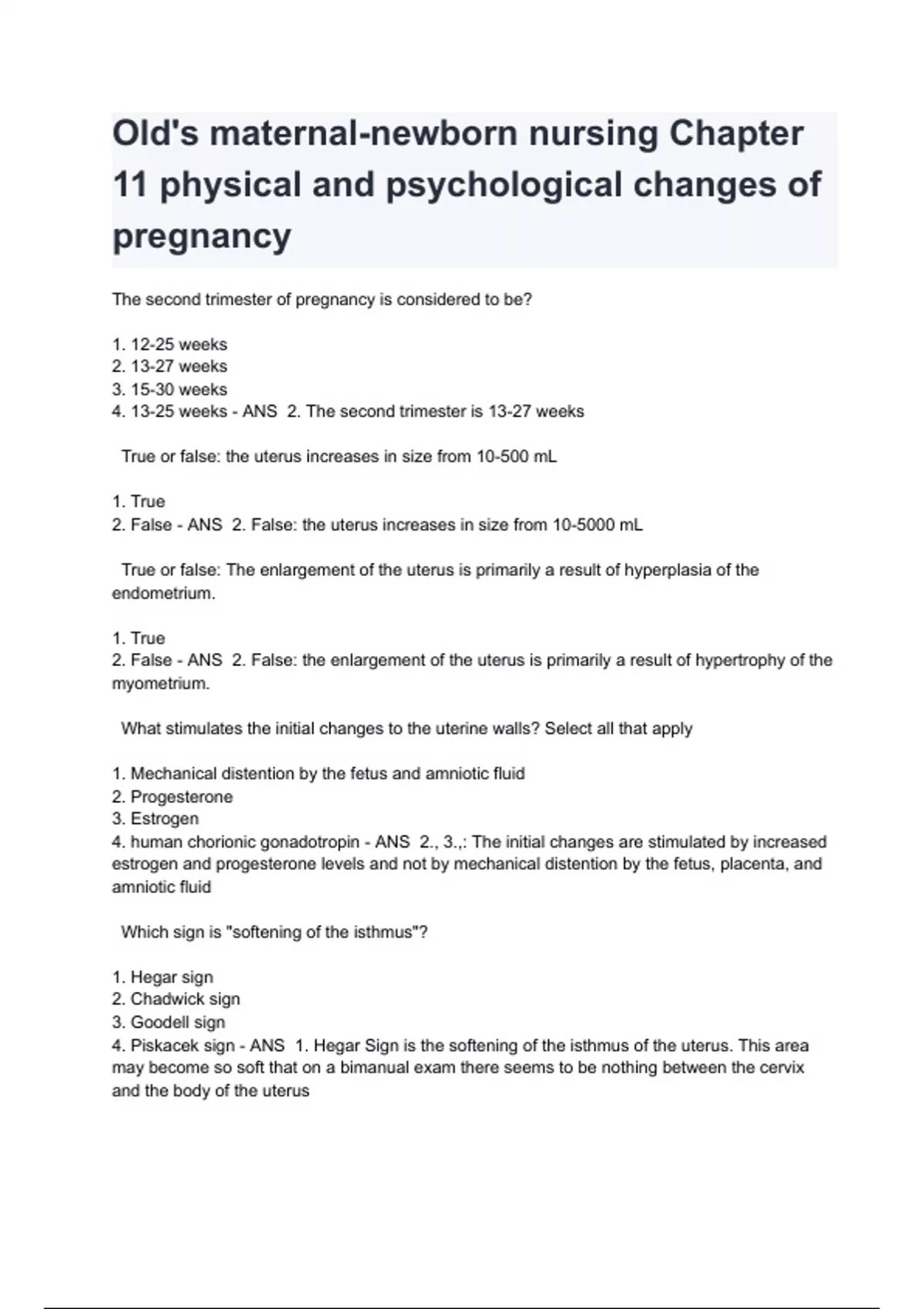 Old's maternal-newborn nursing Chapter 11 physical and psychological changes of pregnancy The second trimester of pregnancy is considered to be? 1. 12-25 weeks 2. 13-27 weeks 3. 15-30 weeks 4. 13-25 weeks - ANS 2. The second trimester is 13-27 weeks True or false: the uterus increases in size from 10-500 mL 1. True 2. False - ANS 2. False: the uterus increases in size from 10-5000 mL True or false: The enlargement of the uterus is primarily a result of hyperplasia of the endometrium. 1. True 2. False - ANS 2. False: the enlargement of the uterus is primarily a result of hypertrophy of the myometrium. What stimulates the initial changes to the uterine walls? Select all that apply 1. Mechanical distention by the fetus and amniotic fluid 2. Progesterone 3. Estrogen 4. human chorionic gonadotropin - ANS 2., 3.,: The initial changes are stimulated by increased estrogen and progesterone levels and not by mechanical distention by the fetus, placenta, and amniotic fluid Which sign is "softening of the isthmus"? 1. Hegar sign 2. Chadwick sign 3. Goodell sign 4. Piskacek sign - ANS 1. Hegar Sign is the softening of the isthmus of the uterus. This area may become so soft that on a bimanual exam there seems to be nothing between the cervix and the body of the uterus True or False: Progesterone stimulates the epithelial tissue of the cervix, which increases in cell number and becomes hyperactive. 1. True 2. False - ANS 2. False: Estrogen stimulates the glandular tissue of the cervix, which increases in cell number and becomes hyperactive. What is the function of the mucous plug of the cervix? 1. To prevent the uterus from prolapsing. 2. To prevent the fetus from accident discharge. 3. To prevent mucous from discharging from the uterus 4. To prevent ascent of microorganisms or other substances into the uterus - ANS 4.