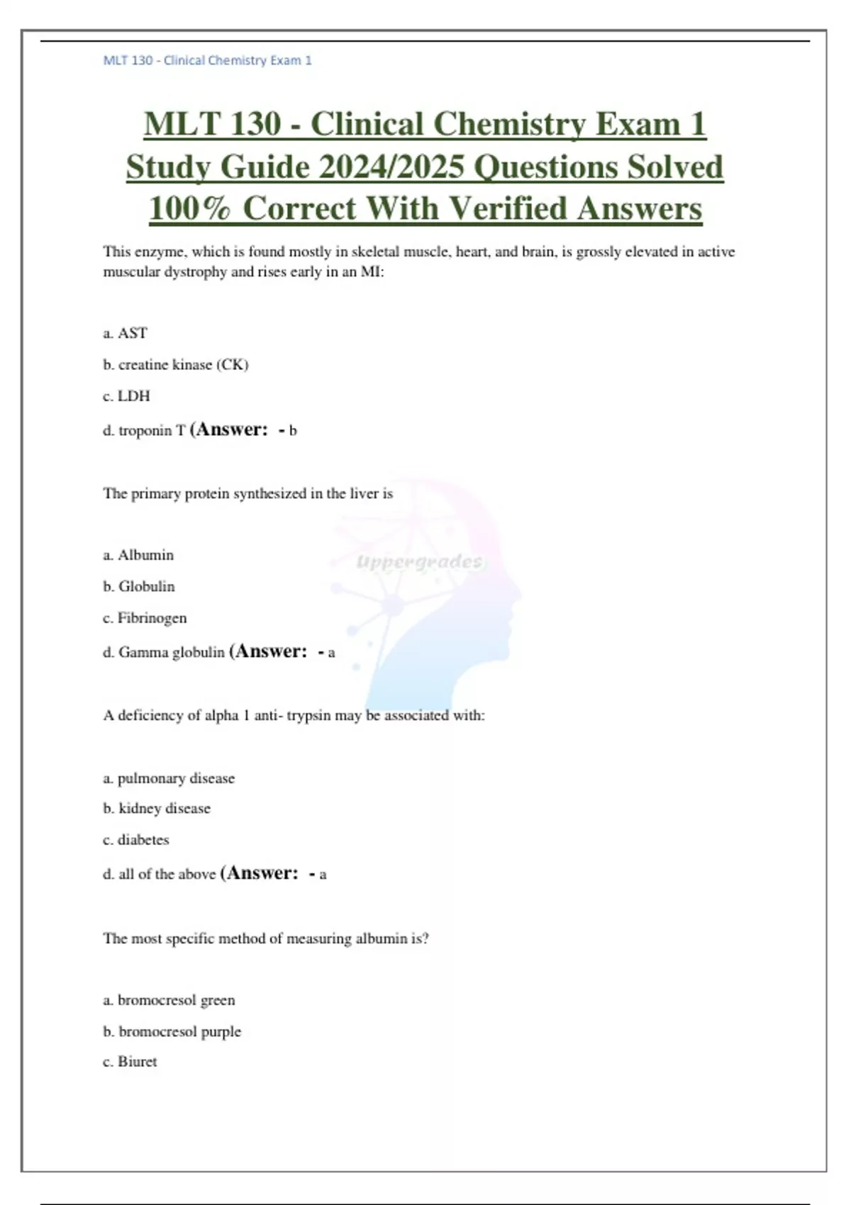 MLT 130 - Clinical Chemistry Exam 1 Study Guide 2024/2025 Questions Solved 100% Correct With Verified Answers,MLT 130 - Clinical Chemistry Exam 1 Study Guide 2024/2025 Questions Solved 100% Correct With Verified Answers,MLT 130 - Clinical Chemistry Exam 1 Study Guide 2024/2025 Questions Solved 100% Correct With Verified Answers