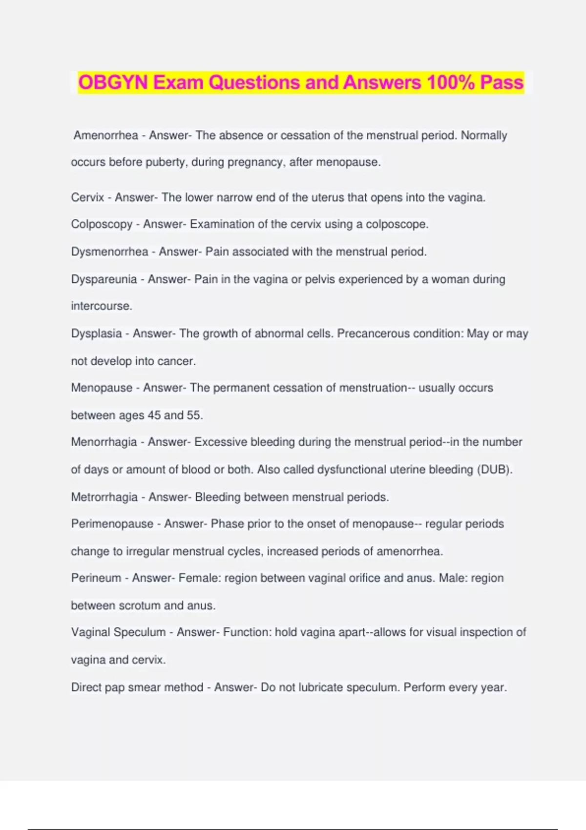 OBGYN Exam Questions and Answers 100% Pass Amenorrhea - Answer- The absence or cessation of the menstrual period. Normally occurs before puberty, during pregnancy, after menopause. Cervix - Answer- The lower narrow end of the uterus that opens into the vagina. Colposcopy - Answer- Examination of the cervix using a colposcope. Dysmenorrhea - Answer- Pain associated with the menstrual period. Dyspareunia - Answer- Pain in the vagina or pelvis experienced by a woman during intercourse. Dysplasia - Answer- The growth of abnormal cells. Precancerous condition: May or may not develop into cancer. Menopause - Answer- The permanent cessation of menstruation-- usually occurs between ages 45 and 55. Menorrhagia - Answer- Excessive bleeding during the menstrual period--in the number of days or amount of blood or both. Also called dysfunctional uterine bleeding (DUB). Metrorrhagia - Answer- Bleeding between menstrual periods. Perimenopause - Answer- Phase prior to the onset of menopause-- regular periods change to irregular menstrual cycles, increased periods of amenorrhea. Perineum - Answer- Female: region between vaginal orifice and anus. Male: region between scrotum and anus. Vaginal Speculum - Answer- Function: hold vagina apart--allows for visual inspection of vagina and cervix. Direct pap smear method - Answer- Do not lubricate speculum. Perform every year. Liquid-based Pap method - Answer- Lubricate speculum with water-based lubricant. Perform every two years. The Pap test - Answer- Consists of a cytology evaluation. Named after developer: Dr. George Papanicolaou. Used for early detection of cervical cancer. Specimen Collection - Answer- Sample of squamous epithelial cells collected. Scraping of cells taken from ectocervix, endocervix. Can also be taken from vagina: Not usually done unless a lesion is observed. Squamous epithelial cells - Answer- Thin, flat layer of cells located on outermost layer of cervix. Bimanual Pelvic Examination - Answer- Index and middle fingers of lubricated gloved hand inserted into vagina. Fingers of other hand placed on patient's lower abdomen. Between the two hands, physician palpates uterus and ovaries for size, shape, position, detection of tenderness or lumps. Trichomonas vaginalis - Answer- Causative agent of trichomoniasis (trich). Trichomoniasis - Answer- Usually (but not always) spread through intercourse. Symptoms: Profuse, frothy vaginal discharge--yellowish-green, unpleasant odor. Itching and irritation of vulva and vagina. Pear-shaped protozoan with flagella: allows for motility of organism. Treatment: metronidazole (Flagyl). Candida albicans - Answer- Yeastlike fungus-- commonly called yeast infection. Treatment: miconazole (Monistat), clotrimazole (GyneLotrimin), nystatin (Mycostatin). Chlamydia - Answer- Caused by bacterium: Chlamydia trachomatis. Fastest spreading sexually transmitted disease in U.S. Occurs most in female adolescents and young adults. First attacks cervix: resulting in cervicitis. Symptoms: Dysuria. Itching and