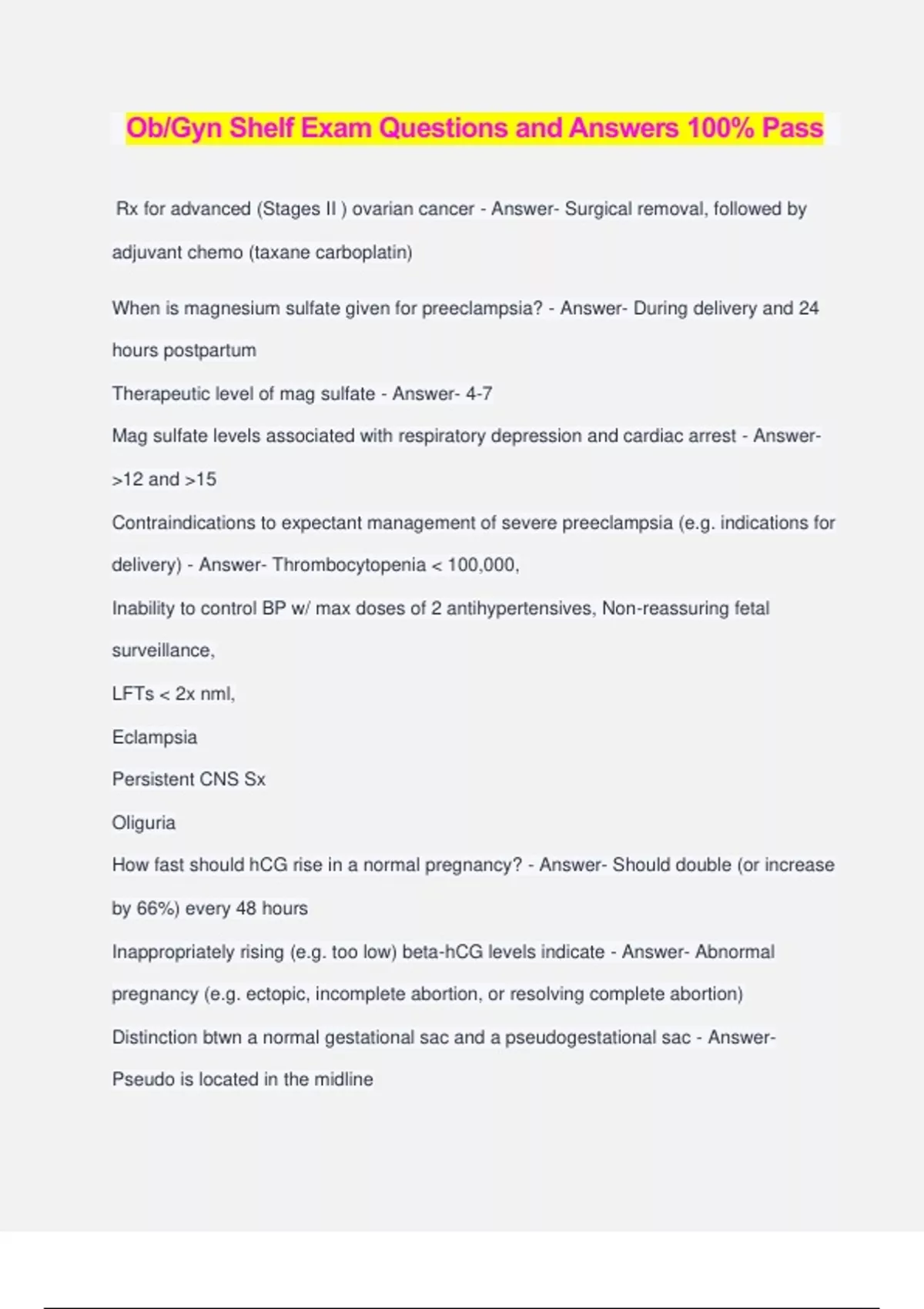 Ob/Gyn Shelf Exam Questions and Answers 100% Pass Rx for advanced (Stages II ) ovarian cancer - Answer- Surgical removal, followed by adjuvant chemo (taxane carboplatin) When is magnesium sulfate given for preeclampsia? - Answer- During delivery and 24 hours postpartum Therapeutic level of mag sulfate - Answer- 4-7 Mag sulfate levels associated with respiratory depression and cardiac arrest - Answer- >12 and >15 Contraindications to expectant management of severe preeclampsia (e.g. indications for delivery) - Answer- Thrombocytopenia < 100,000, Inability to control BP w/ max doses of 2 antihypertensives, Non-reassuring fetal surveillance, LFTs < 2x nml, Eclampsia Persistent CNS Sx Oliguria How fast should hCG rise in a normal pregnancy? - Answer- Should double (or increase by 66%) every 48 hours Inappropriately rising (e.g. too low) beta-hCG levels indicate - Answer- Abnormal pregnancy (e.g. ectopic, incomplete abortion, or resolving complete abortion) Distinction btwn a normal gestational sac and a pseudogestational sac - Answer- Pseudo is located in the midline Serum progesterone <5 indicates - Answer- Specific for nonviable pregnancy What is the Arias-Stella reaction? - Answer- Hypersecretory endometrium of prengnacy on histology that occurs w/ BOTH ectopic and intrauterine pregnancies Culdocentesis is looking for - Answer- Blood in peritoneal cavity, e.g. from ruptured ectopic (or purulent fluid from infection) Medical Rx for ectopic - Answer- Methotrexate Relative contraindications to MTX for ectopic - Answer- Cardiac activity Mass >3.5cm (often correlates with b-hCG > 15,000) Absolute contraindications to MTX - Answer- Breastfeeding, immunodeficient, alcoholic, blood dyscrasia, pulmonary disease, PUD, hepatic/renal/hematology dysfxn When is more than one dose of MTX needed? - Answer- If beta-hCG levels plateau or increase after 7 days Asherman's Syndrome includes the presence of what? - Answer- Uterine synechiae (intrauterine adhesions) What is threatened abortion, what is the risk of subsequent spontaneous abortion, and what are the risks if carry to viability? - Answer- Bleeding in the first trimester without tissue or fluid loss 50% Greater risk of preterm and low birth weight What is inevitable abortion? - Answer- Gross rupture of membranes w/ cervical dilation (contractions typically begin soon afterward) After what time are the fetus and placenta typically expelled separately? - Answer- 10wks After how many days should surgical abortion be performed instead of medical? - Answer- 49 days since LMP 3 drugs for early medical abortion - Answer- Mifepristone (antiprogestin), MTX (antimetabolite), misoprostol (prostaglandin) All induce uterine contractility, either directly (misoprostol) or by decreasing progesterone inhibition Rx for a septic abortion - Answer- Broad spectrum IV Abx, IVF, prompt evacuation of uterus What is postabortal syndrome and how is it treated? - Answer- Uterus fails to remain contracted after spontaneous abortion or elective abortion (pain, bleeding, open cervix, hematometra) Suction curettage At what beta-hCG level can an intrauterine pregnancy be appreciated? - Answer- >2000 Most common abnormal karyotope in aborted fetuses - Answer- Autosomal trisomy Systemic maternal diseases associated w/ early pregnancy loss - Answer- DM, SLE, CKD Rx for significant anemia during spontaneous abortion - Answer- D Effect of single, prior first trimester surgical abortion on fertility/ likelihood of future early pregnancy losses - Answer- No effect/ no increased risk Once pt at high risk for cervical cancer and has lesion, management option - Answer- Cervical biopsy (can skip Pap smear, a screening test, as well as colposcopy since lesion can already be visualized) Screening tests for a normal African American couple wanting to conceive - Answer- CBC and Hb electrophoresis Valproic acid is associated with an increased risk of these three abnormalities - Answer- Neural tube defects, hydrocephalus and craniofacial malformations Women with poorly controlled DM during organogenesis are at risk for structural anomalies in these two systems - Answer- CNS and CV Chorionic villus sampling is used to detect - Answer- Chromosomal abnormalities Three components of triple screen extra of quad screen - Answer- AFP, hCG, unconjugated estriol Inhibin A Test for Down's in first trimester - Answer- PAPP A (pregnancy associated plasma protein A) Risk of fetal loss with CVS - Answer- 1%