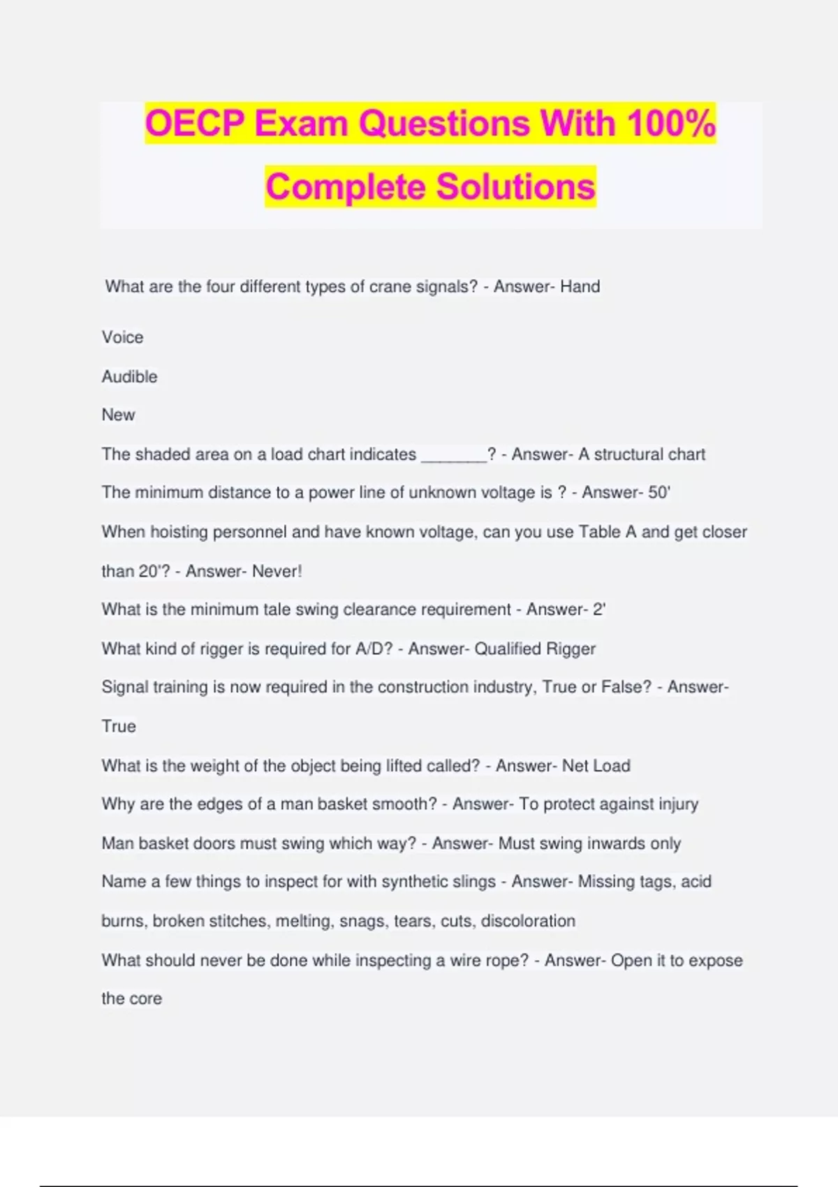 OECP Exam Questions With 100% Complete Solutions What are the four different types of crane signals? - Answer- Hand Voice Audible New The shaded area on a load chart indicates _______? - Answer- A structural chart The minimum distance to a power line of unknown voltage is ? - Answer- 50' When hoisting personnel and have known voltage, can you use Table A and get closer than 20'? - Answer- Never! What is the minimum tale swing clearance requirement - Answer- 2' What kind of rigger is required for A/D? - Answer- Qualified Rigger Signal training is now required in the construction industry, True or False? - Answer- True What is the weight of the object being lifted called? - Answer- Net Load Why are the edges of a man basket smooth? - Answer- To protect against injury Man basket doors must swing which way? - Answer- Must swing inwards only Name a few things to inspect for with synthetic slings - Answer- Missing tags, acid burns, broken stitches, melting, snags, tears, cuts, discoloration What should never be done while inspecting a wire rope? - Answer- Open it to expose the core A few things to be checked for in a wire rope inspection are - Answer- Corrosion, crushed strands, bird caging, high stranding, core protrusion, damaged end fittings, heat damage from any source If the horizontal sling angle decreases, the rated capacity - Answer- Decreases How much does concrete weigh per cubic foot? - Answer- 150 lbs. When making a lift in excess of 75% of rated capacity, this would be considered a ? - Answer- Critical lift All lifting devices are load tested to how much? - Answer- 125% How many people signal the cranes on a 2 crane pick? - Answer- 1 On a multi crane pick, each crane should be loaded to no more than what percentage of its rated capacity? - Answer- 75% The highest cause of fatalities in crane accidents is ? - Answer- Electrocution What is a C rated fire extinguisher used for? - Answer- Electrical fires, anything to do with CURRENT The weight of a stationary load is called ? - Answer- Static load What will a properly configured LMI indicate? - Answer- Potential Overload New signals must be ? - Answer- Equally effective The minimum distance to pass below power lines with no load and the crane in its transport configuration is ...? - Answer- 4' A crane operator must be certified for the _____ and ______ of the crane they will operate - Answer- Type and capacity What is the horizontal distance from the center of rotation to the center of the suspended load called? - Answer- Load radius A jib is primarily used for ? - Answer- Height What is the principle of leverage? - Answer- Weight x distance = distance x weight Whats the formula to find the estimated weight of a square object - Answer- length x width x height x unit weight What happens to the rated capacity at a given radius when handling personnel? - Answer- It is de-rated 50% The first thing done on site when lifting personnel is ? - Answer- A pre-lift meeting A critical lift would be in excess of what percentage of rated capacity? - Answer- 75% What should be tested at the beginning of a critical lift? - Answer- The brakes When assembling boom, what kind of chart will be used? - Answer- Boom composition chart As the pre-lift that must be investigated by a planning group are completed, the results are entered and filled in a series of ? - Answer- Checklists According to OSHA, during A/D, at what height must you tie off? - Answer- 15' A personnel basket shall be proof load tested to what percent? - Answer- 125% The maximum angle on a shackle or a collector ring is what? - Answer- 120 degrees What is the recommended fleet angle for a smooth drum? - Answer- .5-1.5 degrees What are the safety factors for regular running ropes? - Answer- 3.5 to 1 for normal use and 3 to 1 for boom erection What must be provided from the operators station to an exit door on the operators side? - Answer- A clear passageway out What is the capacity rating of a basket hitch? - Answer- 200% How do you install wire rope from a reel to a drum? - Answer- Top to top or bottom to bottom The end of a cable protruding from a socket should be ______? - Answer- Between 10 and 20 rope diameters but never less than 6" The wedge and socket must be _______? - Answer- The correct size What recommended length should wire rope be seized to? - Answer- 1 to 1.5 times the diameter of the rope What is the minimum distance ANSI and PCSA allow for a drum flange to extend above the top layer of rope? - Answer- 1/2" What is the recommended fleet angle for a grooved drum? - Answer- 0.5 to 2.0 degrees What is the distance between the waterline and the deck of a barge? - Answer- Freeboard The movement of a barge from side to side is called - Answer- List Movement front to back on a barge is - Answer- Trim Maximum wind speed for lifting personnel recommended by ANSI is - Answer- 20 mph Shift and monthly inspections are performed by a - Answer- Competent person What do asterisks signify on a load chart - Answer- Structural capacity The maximum list allowed for a land crane on a barge is - Answer- 5 degrees Land cranes on a barge fall under what ANSI standard - Answer- B30.8 The dynamic movement of a barge can make lifts be what - Answer- Unpredictable Never ballast an open hull barge with what? - Answer- Water