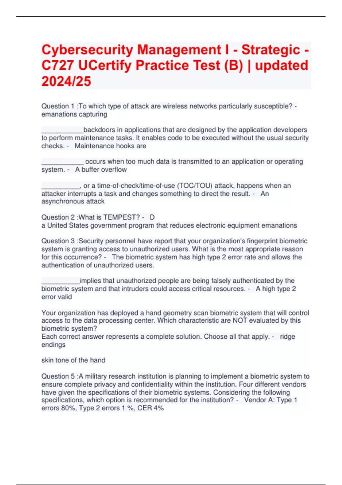 Cybersecurity Management I - Strategic - C727 UCertify Practice Test (B) | updated 2024/25