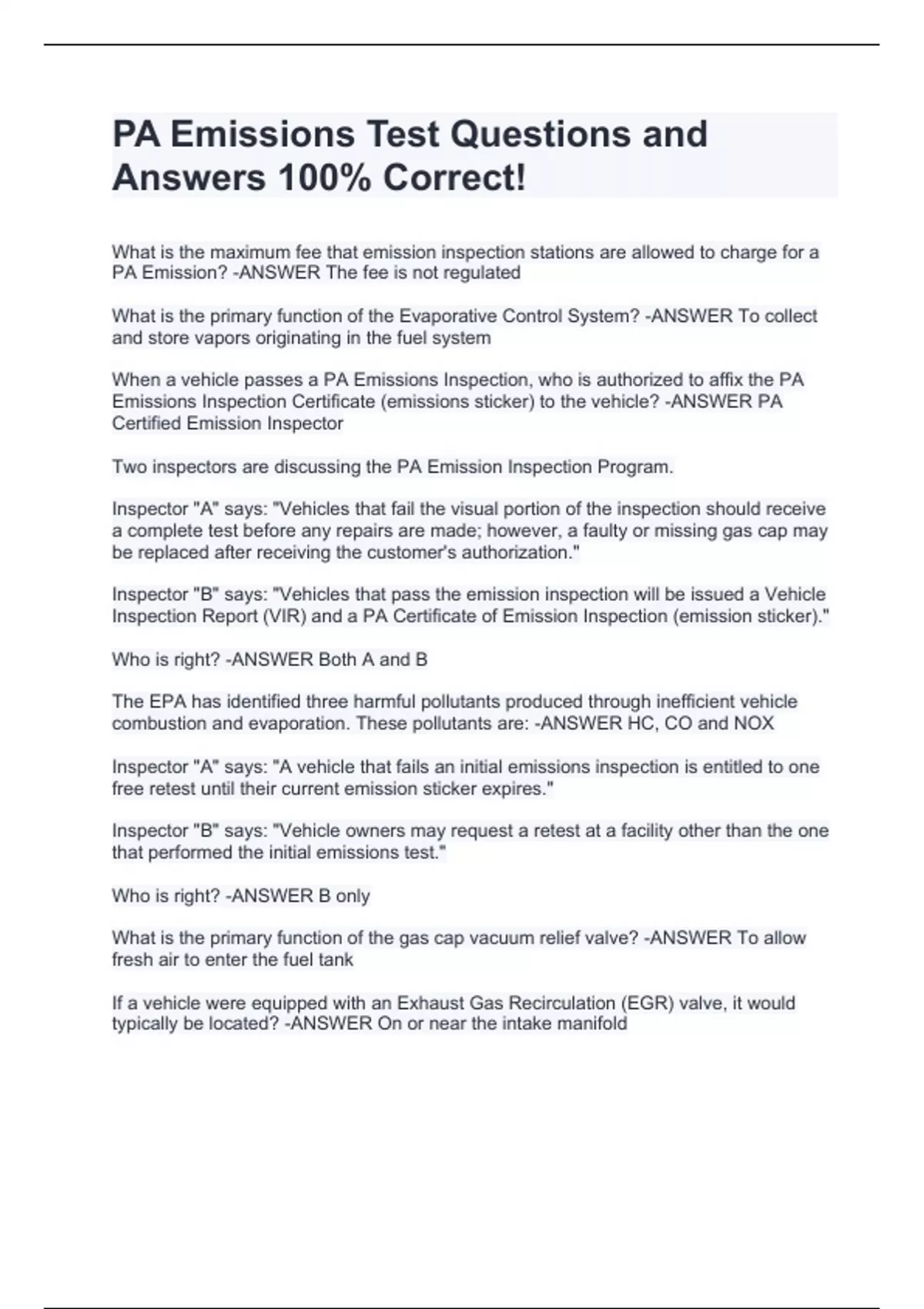 What is the maximum fee that emission inspection stations are allowed to charge for a PA Emission? -ANSWER The fee is not regulated What is the primary function of the Evaporative Control System? -ANSWER To collect and store vapors originating in the fuel system When a vehicle passes a PA Emissions Inspection, who is authorized to affix the PA Emissions Inspection Certificate (emissions sticker) to the vehicle? -ANSWER PA Certified Emission Inspector Two inspectors are discussing the PA Emission Inspection Program. Inspector "A" says: "Vehicles that fail the visual portion of the inspection should receive a complete test before any repairs are made; however, a faulty or missing gas cap may be replaced after receiving the customer's authorization." Inspector "B" says: "Vehicles that pass the emission inspection will be issued a Vehicle Inspection Report (VIR) and a PA Certificate of Emission Inspection (emission sticker)." Who is right? -ANSWER Both A and B The EPA has identified three harmful pollutants produced through inefficient vehicle combustion and evaporation. These pollutants are: -ANSWER HC, CO and NOX Inspector "A" says: "A vehicle that fails an initial emissions inspection is entitled to one free retest until their current emission sticker expires." Inspector "B" says: "Vehicle owners may request a retest at a facility other than the one that performed the initial emissions test." Who is right? -ANSWER B only What is the primary function of the gas cap vacuum relief valve? -ANSWER To allow fresh air to enter the fuel tank If a vehicle were equipped with an Exhaust Gas Recirculation (EGR) valve, it would typically be located? -ANSWER On or near the intake manifold