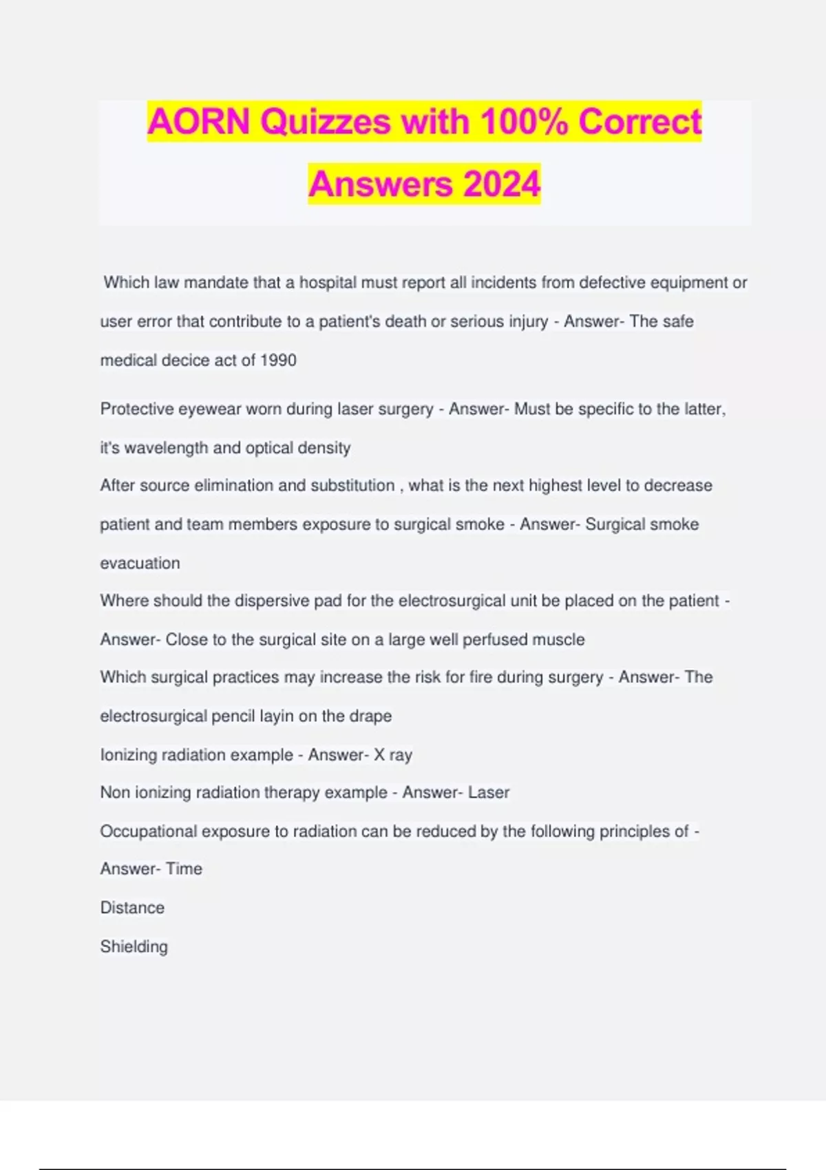 AORN Quizzes with 100% Correct Answers 2024 Which law mandate that a hospital must report all incidents from defective equipment or user error that contribute to a patient's death or serious injury - Answer- The safe medical decice act of 1990 Protective eyewear worn during laser surgery - Answer- Must be specific to the latter, it's wavelength and optical density After source elimination and substitution , what is the next highest level to decrease patient and team members exposure to surgical smoke - Answer- Surgical smoke evacuation Where should the dispersive pad for the electrosurgical unit be placed on the patient - Answer- Close to the surgical site on a large well perfused muscle Which surgical practices may increase the risk for fire during surgery - Answer- The electrosurgical pencil layin on the drape Ionizing radiation example - Answer- X ray Non ionizing radiation therapy example - Answer- Laser Occupational exposure to radiation can be reduced by the following principles of - Answer- Time Distance Shielding What resource should be available to the surgical team when questions arise on how to safety use the surgical equipment - Answer- Manufacturers IFU A patient who is experiencing severe pain, a lack of sensation, Ed's a, vascular compromise and restricted Movement in the extremely after the use of a pneumatic tourniquet is most likely exhibiting the clinical manifestations of - Answer- Compartment syndrome Which of the following would be an appropriate action for the PeriOp nurse when assisting with anesthesia (to prevent aspiration) - Answer- Apply criocoid pressure if needed during intubation Basic monitoring for pt with anesthesia - Answer- BP, pulse, 02 What drug is used to reverse Valium and midazolam - Answer- Flumazenil How can the PeriOp nurse assist anesthesia with placement of a spinal or epidural block - Answer- Calm the pt What complication can arise with tourniquet deflation at the end of a Bier block procedure - Answer- Bolts of anesthetic What is the most consistent indicator of malignant hyperthermia during a surgical intervention - Answer- Sustained end tital co2 What are the signs the ot is experiencing local anesthetic system toxicity - Answer- Ringing in the ears, dizziness, peri oral tingling Which assessment factor is important to include when screening patient for potential risk of malignant hyperthermia - Answer- Fam hx which area is considered a sterile area of a surgical gown - Answer- front of the gown how often should surgical gloves be changed during surgery - Answer- every 90-150 mins how should a surgical hand rub be applied - Answer- according to manufactures instructions what is an example of a glove perforation indicator system - Answer- inner glove is a different color from the outer glove for initial gloving after you have donned a sterile gown, what self gloving technique should you use? - Answer- closed gloving you are helping a team member don sterile gown and gloves. assist the team member by - Answer- releasing the gown and stepping away once the team members arms are in the gown you are assigned to scrub for a surgical procedure and you know there will be a high risk of blood and fluid exposure and a significant amount of fluid drainage and irrigation. which ansi/aami class of surgical gown should you wear? - Answer- level 4 which of the following should be worn on the hands during surgical hand antisepsis? a. a bracelet b. a ring c. a watch d. none of these - Answer- d. none of these what actions should be taken first to remove a gown and gloves after the completion of a surgical procedure? - Answer- with gloved hands, pull the gown away from your body, breaking the ties, roll it into a bundle, and only touching the outside of the gown