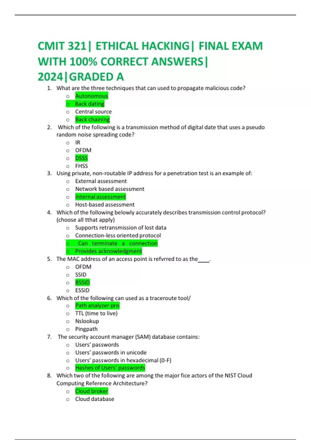 CMIT 321| ETHICAL HACKING| FINAL EXAM WITH 100% CORRECT ANSWERS| 2024|GRADED A 1. What are the three techniques that can used to propagate malicious code? o Autonomous o Back dating o Centralsource o Back chaining 2. Which of the following is a transmission method of digital date that uses a pseudo random noise spreading code? o IR o OFDM o DSSS o FHSS 3. Using private, non-routable IP address for a penetration test is an example of: o External assessment o Network based assessment o Internal assessment o Host-based assessment 4. Which of the following belowly accurately describes transmission control protocol? (choose all tthat apply) o Supports retransmission of lost data o Connection-less oriented protocol o Can terminate a connection o Provides acknowledgment