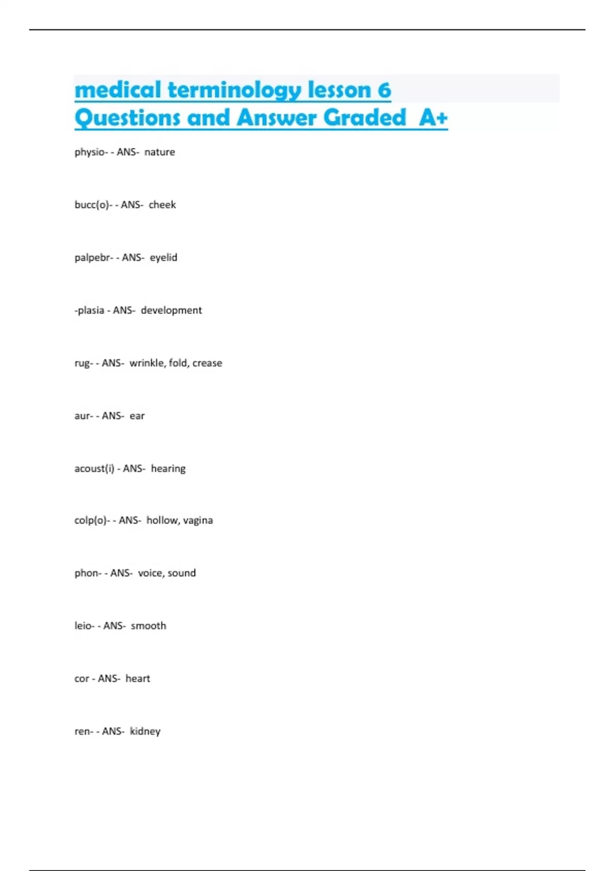 medical terminology lesson 6 Questions and Answer Graded A+ physio- - ANS- nature bucc(o)- - ANS- cheek palpebr- - ANS- eyelid -plasia - ANS- development rug- - ANS- wrinkle, fold, crease aur- - ANS- ear acoust(i) - ANS- hearing colp(o)- - ANS- hollow, vagina phon- - ANS- voice, sound leio- - ANS- smooth cor - ANS- heart ren- - ANS- kidney orchi- - ANS- testis encephal- - ANS- brain thalam- - ANS- inner chamber plexus - ANS- braid cilia - ANS- eyelash dendr- - ANS- tree, branching phleb- - ANS- vein pilo- - ANS- hair histo- - ANS- tissue stoma- - ANS- mouth tympan- - ANS- eardrum umbili- - ANS- naval salpingo- - ANS- tube