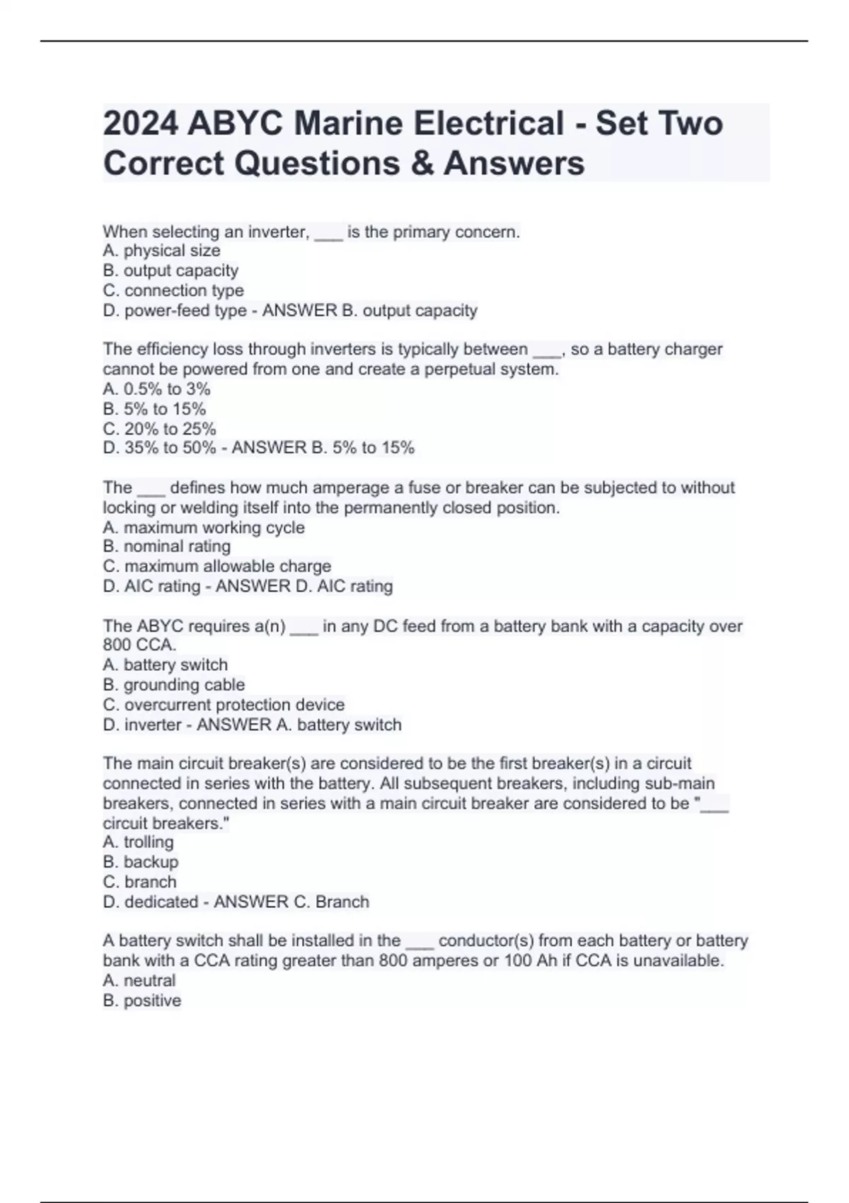 When selecting an inverter, ___ is the primary concern. A. physical size B. output capacity C. connection type D. power-feed type - ANSWER B. output capacity The efficiency loss through inverters is typically between ___, so a battery charger cannot be powered from one and create a perpetual system. A. 0.5% to 3% B. 5% to 15% C. 20% to 25% D. 35% to 50% - ANSWER B. 5% to 15% The ___ defines how much amperage a fuse or breaker can be subjected to without locking or welding itself into the permanently closed position. A. maximum working cycle B. nominal rating C. maximum allowable charge D. AIC rating - ANSWER D. AIC rating The ABYC requires a(n) ___ in any DC feed from a battery bank with a capacity over 800 CCA. A. battery switch B. grounding cable C. overcurrent protection device D. inverter - ANSWER A. battery switch The main circuit breaker(s) are considered to be the first breaker(s) in a circuit connected in series with the battery. All subsequent breakers, including sub-main breakers, connected in series with a main circuit breaker are considered to be "___ circuit breakers." A. trolling B. backup C. branch D. dedicated - ANSWER C. Branch A battery switch shall be installed in the ___ conductor(s) from each battery or battery bank with a CCA rating greater than 800 amperes or 100 Ah if CCA is unavailable. A. neutral B. positive C. negative D. grounded E. Band - ANSWER B. positive ___ of the AC output waveform from some inverters may affect the operation of some GFCI devices. A. Harmonic distortion B. Electromagnetic induction C. Voltage drop D. Electronic noise - ANSWER A. Harmonic distortion Since some inverters do not necessarily output a true sine waveform of AC, a DVOM that uses a(n) ___ algorithm for interpreting what it "sees" is a must. A. simple recursive B. backtracking C. true root mean square (RMS) D. approximate - ANSWER C. true root mean square (RMS) Gear that functions normally when run from a shore power source but either functions erratically or not at all when run from an inverter (or generator) is almost always a(n) ___ issue. A. subsystem B. wiring C. overheating D. waveform - ANSWER D. waveform A(n) ___ reads the strength of a magnetic field emission and can be used to establish a "safe zone of separation" between inverters and magnetically sensitive equipment.