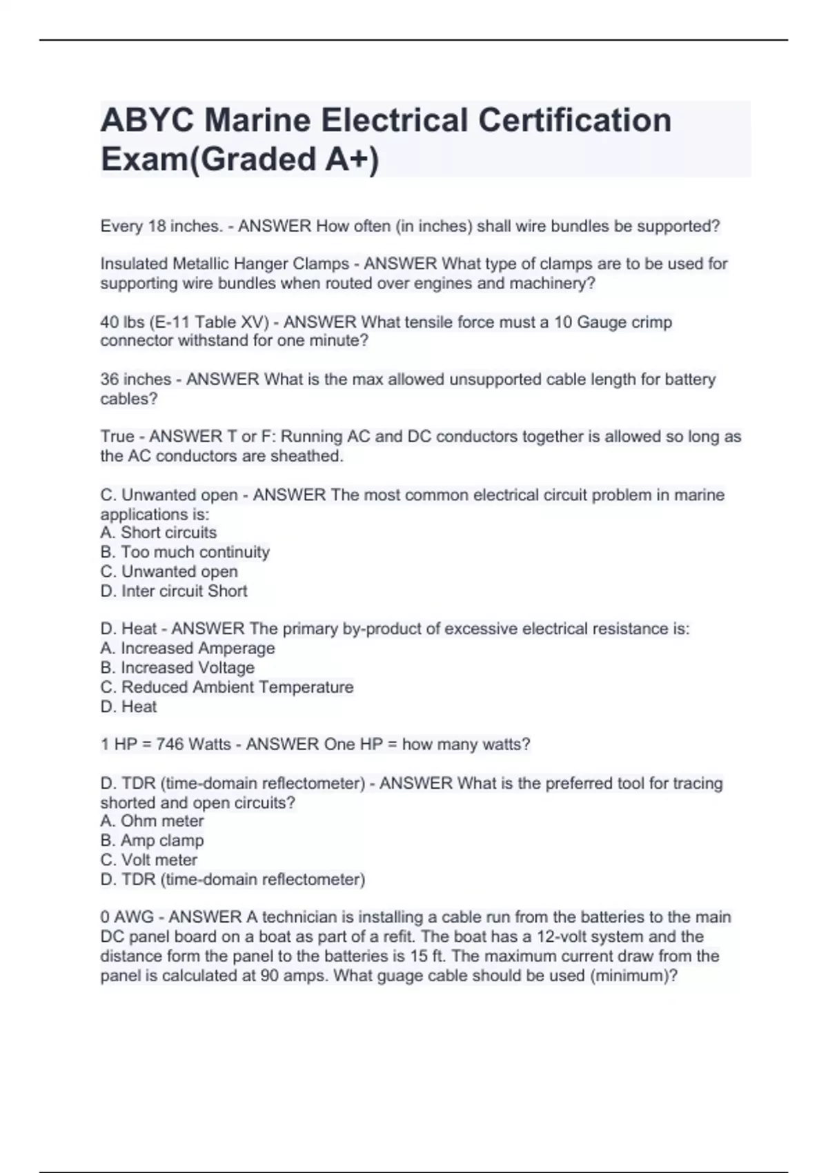 Every 18 inches. - ANSWER How often (in inches) shall wire bundles be supported? Insulated Metallic Hanger Clamps - ANSWER What type of clamps are to be used for supporting wire bundles when routed over engines and machinery? 40 lbs (E-11 Table XV) - ANSWER What tensile force must a 10 Gauge crimp connector withstand for one minute? 36 inches - ANSWER What is the max allowed unsupported cable length for battery cables? True - ANSWER T or F: Running AC and DC conductors together is allowed so long as the AC conductors are sheathed. C. Unwanted open - ANSWER The most common electrical circuit problem in marine applications is: A. Short circuits B. Too much continuity C. Unwanted open D. Inter circuit Short D. Heat - ANSWER The primary by-product of excessive electrical resistance is: A. Increased Amperage B. Increased Voltage C. Reduced Ambient Temperature D. Heat 1 HP = 746 Watts - ANSWER One HP = how many watts? D. TDR (time-domain reflectometer) - ANSWER What is the preferred tool for tracing shorted and open circuits? A. Ohm meter B. Amp clamp C. Volt meter D. TDR (time-domain reflectometer) 0 AWG - ANSWER A technician is installing a cable run from the batteries to the main DC panel board on a boat as part of a refit. The boat has a 12-volt system and the distance form the panel to the batteries is 15 ft. The maximum current draw from the panel is calculated at 90 amps. What guage cable should be used (minimum)? Yellow - ANSWER DC grounded conductors on new boats that are also equipped with