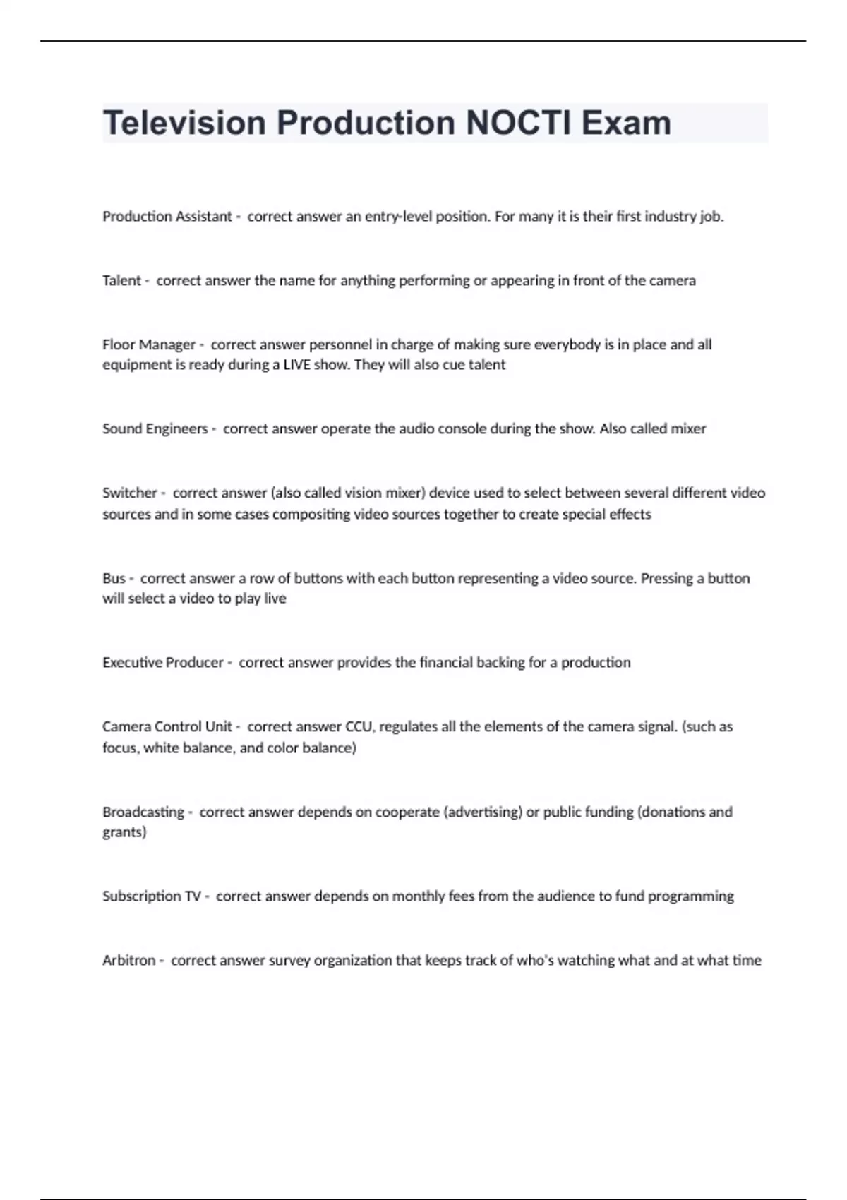 Television Production NOCTI Exam question with complete solution 2024Production Assistant - correct answer an entry-level position. For many it is their first industry job. Talent - correct answer the name for anything performing or appearing in front of the camera Floor Manager - correct answer personnel in charge of making sure everybody is in place and all equipment is ready during a LIVE show. They will also cue talent Sound Engineers - correct answer operate the audio console during the show. Also called mixer Switcher - correct answer (also called vision mixer) device used to select between several different video sources and in some cases compositing video sources together to create special effects Bus - correct answer a row of buttons with each button representing a video source. Pressing a button will select a video to play live Executive Producer - correct answer provides the financial backing for a production Camera Control Unit - correct answer CCU, regulates all the elements of the camera signal. (such as focus, white balance, and color balance) Broadcasting - correct answer depends on cooperate (advertising) or public funding (donations and grants) Subscription TV - correct answer depends on monthly fees from the audience to fund programming Arbitron - correct answer survey organization that keeps track of who's watching what and at what time Ratings - correct answer info of who, what, and when are watching Shares - correct answer a tally of how many people are watching a given program Demographics - correct answer measure of what type of people are watching (race, age, gender, etc.) Primetime - correct answer (between 8-11pm) is the time mot people are at home and watching Commercials - correct answer generate income for the broadcaster to pay for the cost of producing or acquiring the program Focus Groups - correct answer screen a show and meet to discuss likes and dislikes Concept - correct answer the initial idea for a show Treatment - correct answer a brief narrative description of what a program will be Storyboard - correct answer a comic book styled sequence of drawings that will help the crew understand the director's vision Outline - correct answer the scene by scene development of the events in your teleplay Federal Communications Commission (FCC) - correct answer an organization to license Radio and Television stations. They determine the standards and practices American Society of Composer and Performers (ASCAP) and Broadcast Music Inc. (BMI) - correct answer two organizations (full name and letters) that license music rights to show producers Release Form - correct answer all persons appearing in a film must sign this which gives the film maker the right to use the face and likeness of the performer in the finished film