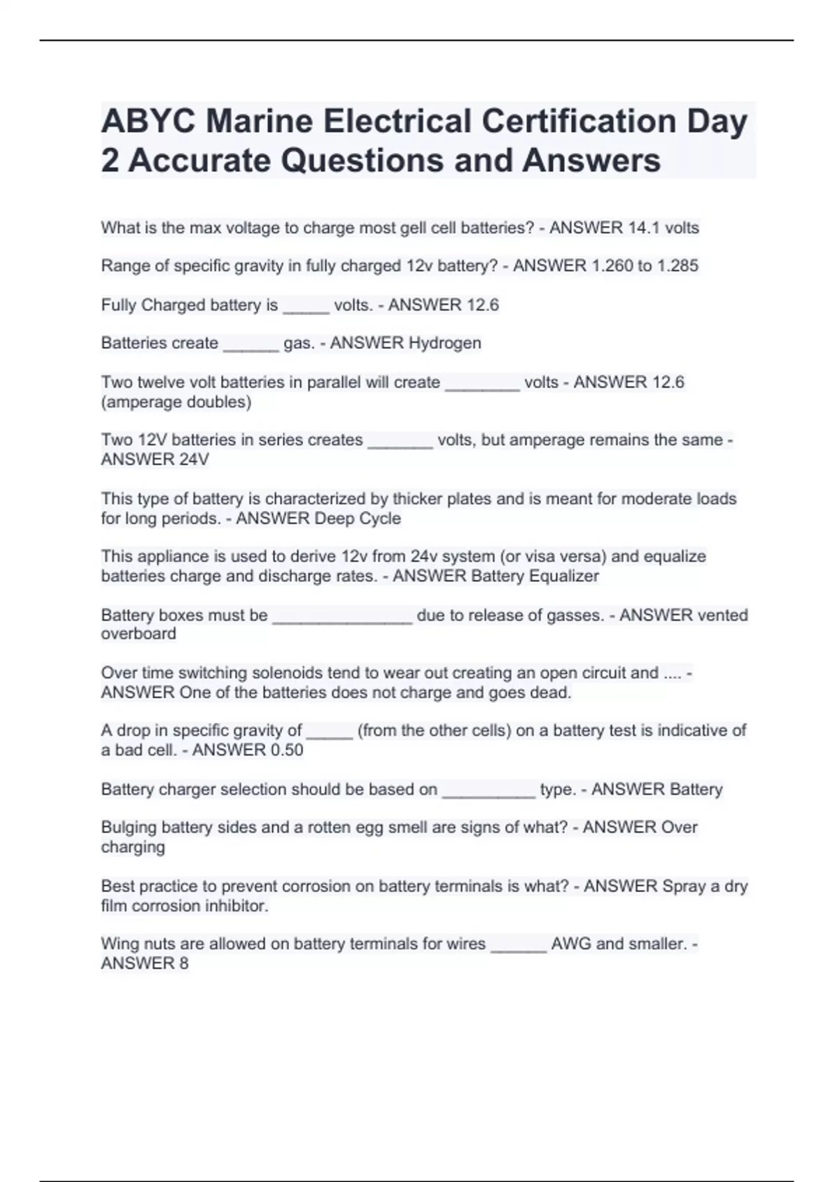 What is the max voltage to charge most gell cell batteries? - ANSWER 14.1 volts Range of specific gravity in fully charged 12v battery? - ANSWER 1.260 to 1.285 Fully Charged battery is _____ volts. - ANSWER 12.6 Batteries create ______ gas. - ANSWER Hydrogen Two twelve volt batteries in parallel will create ________ volts - ANSWER 12.6 (amperage doubles) Two 12V batteries in series creates _______ volts, but amperage remains the same - ANSWER 24V This type of battery is characterized by thicker plates and is meant for moderate loads for long periods. - ANSWER Deep Cycle This appliance is used to derive 12v from 24v system (or visa versa) and equalize batteries charge and discharge rates. - ANSWER Battery Equalizer Battery boxes must be _______________ due to release of gasses. - ANSWER vented overboard Over time switching solenoids tend to wear out creating an open circuit and .... - ANSWER One of the batteries does not charge and goes dead. A drop in specific gravity of _____ (from the other cells) on a battery test is indicative of a bad cell. - ANSWER 0.50 Battery charger selection should be based on __________ type. - ANSWER Battery Bulging battery sides and a rotten egg smell are signs of what? - ANSWER Over charging Best practice to prevent corrosion on battery terminals is what? - ANSWER Spray a dry film corrosion inhibitor. Wing nuts are allowed on battery terminals for wires ______ AWG and smaller. - ANSWER 8