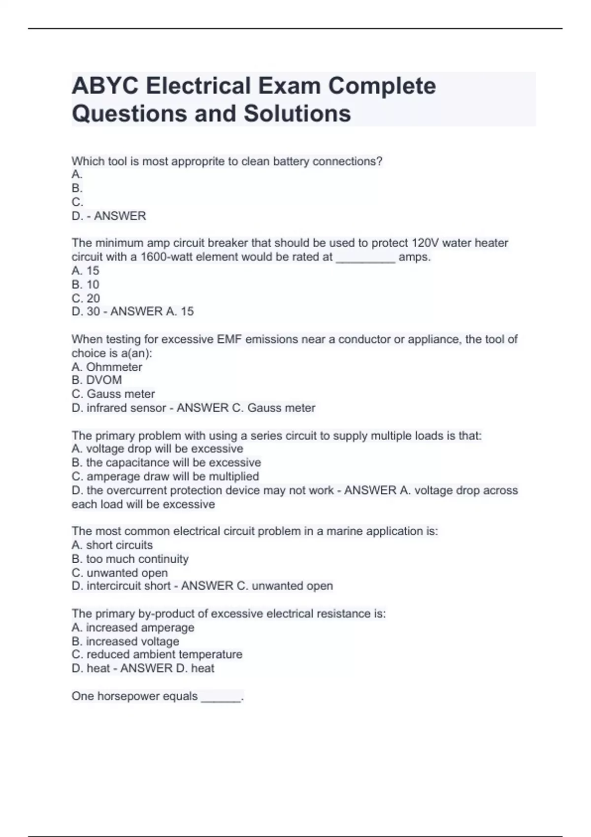 Which tool is most approprite to clean battery connections? A. B. C. D. - ANSWER The minimum amp circuit breaker that should be used to protect 120V water heater circuit with a 1600-watt element would be rated at _________ amps. A. 15 B. 10 C. 20 D. 30 - ANSWER A. 15 When testing for excessive EMF emissions near a conductor or appliance, the tool of choice is a(an): A. Ohmmeter B. DVOM C. Gauss meter D. infrared sensor - ANSWER C. Gauss meter The primary problem with using a series circuit to supply multiple loads is that: A. voltage drop will be excessive B. the capacitance will be excessive C. amperage draw will be multiplied D. the overcurrent protection device may not work - ANSWER A. voltage drop across each load will be excessive The most common electrical circuit problem in a marine application is: A. short circuits B. too much continuity C. unwanted open D. intercircuit short - ANSWER C. unwanted open The primary by-product of excessive electrical resistance is: A. increased amperage B. increased voltage C. reduced ambient temperature D. heat - ANSWER D. heat One horsepower equals ______. A. 1000 watts B. 746 watts C. 536 watts D. 146 watts - ANSWER B. 746 watts Excessive electrical resistance can be caused by __________. A. oversized conductors, loose terminals, and corrosion. B. improper wire insulation and excessive wire strand count. C. fuses with too high of a rating and wattage that is too low. D. undersized wire, loose connections, and corrosion. - ANSWER D. undersized wire, loos