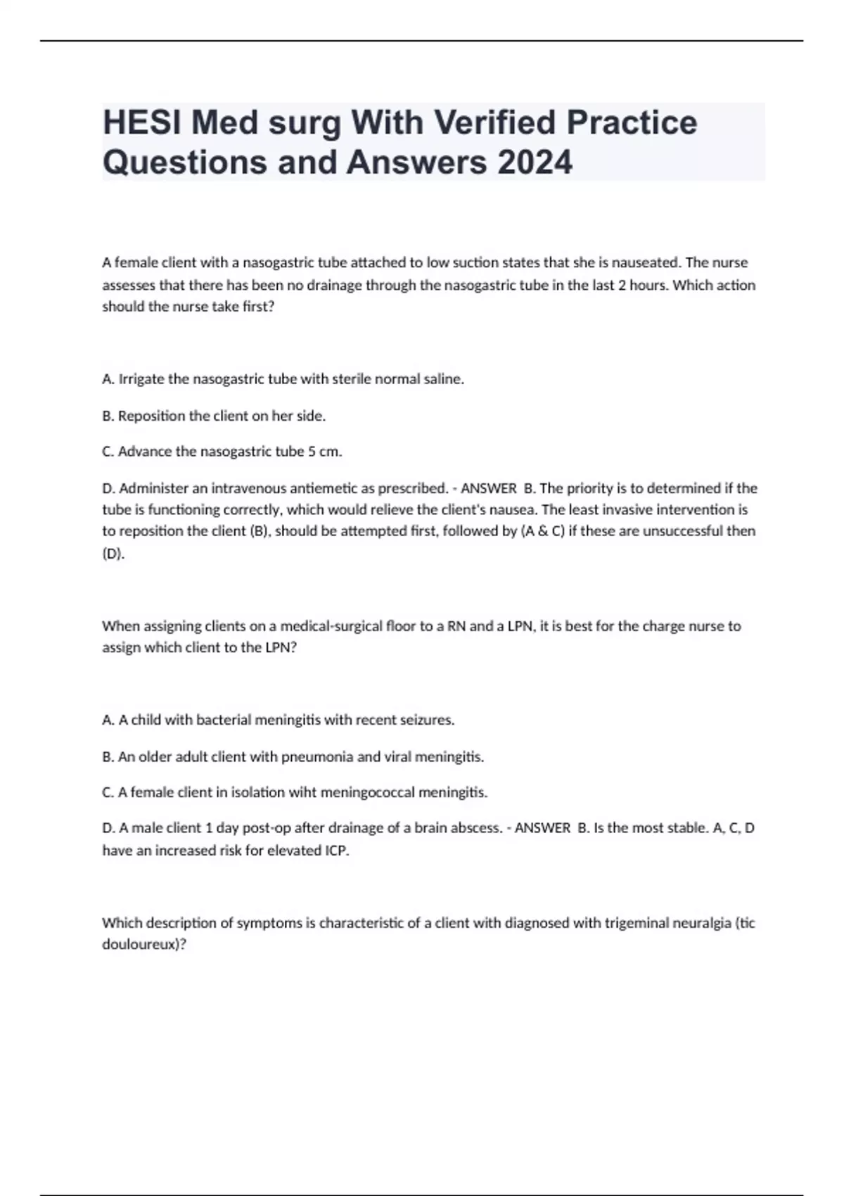 HESI Med surg With Verified Practice Questions and Answers 2024 A female client with a nasogastric tube attached to low suction states that she is nauseated. The nurse assesses that there has been no drainage through the nasogastric tube in the last 2 hours. Which action should the nurse take first? A. Irrigate the nasogastric tube with sterile normal saline. B. Reposition the client on her side. C. Advance the nasogastric tube 5 cm. D. Administer an intravenous antiemetic as prescribed. B. The priority is to determined if the tube is functioning correctly, which would relieve the client's nausea. The least invasive intervention is to reposition the client (B), should be attempted first, followed by (A & C) if these are unsuccessful then (D). When assigning clients on a medical-surgical floor to a RN and a LPN, it is best for the charge nurse to assign which client to the LPN? A. A child with bacterial meningitis with recent seizures. B. An older adult client with pneumonia and viral meningitis. C. A female client in isolation wiht meningococcal meningitis. D. A male client 1 day post-op after drainage of a brain abscess. B. Is the most stable. A, C, D have an increased risk for elevated ICP. Which description of symptoms is characteristic of a client with diagnosed with trigeminal neuralgia (tic douloureux)? A. Tinnitus, vertigo, and hearing difficulties. B. Sudden, stabbing, severe pain over the lip and chin. C. Unilateral facial weakness and paralysis. D. Difficulty in talking, chewing, and swallowing. B. Trigeminal neuralgia is characterized by paroxysms of pain, similar to an electric shock, in the area innervated by one or more branches of the trigeminal nerve. A. Characteristic of Meniere's C. Characteristic of Bell palsey D. Characteristic of disorders of the hypoglossal (12th cranial nerve)
