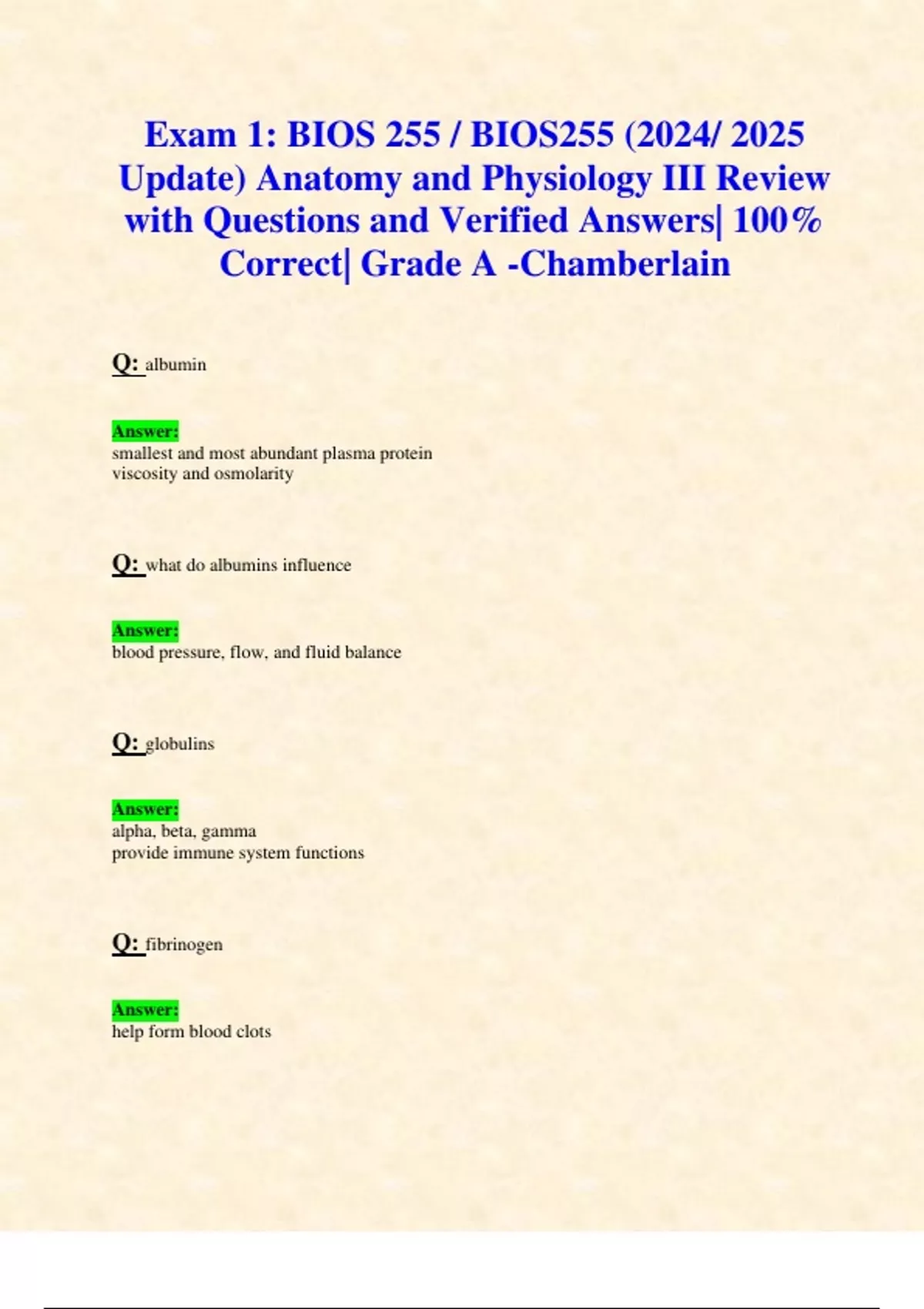Exam 1: BIOS 255 / BIOS255 (2024/ 2025 Update) Anatomy and Physiology III Review with Questions and Verified Answers| 100% Correct| Grade A -Chamberlain Q: albumin smallest and most abundant plasma protein viscosity and osmolarity Q: what do albumins influence Answer: blood pressure, flow, and fluid balance Q: globulins Answer: alpha, beta, gamma provide immune system functions Q: fibrinogen Answer: help form blood clots Q: RBCs (erythrocytes) count Answer: 4.2-6.2 million uL Q: WBCs (leukocytes) count Answer: 5000-10,000 uL Q: platelet count Answer: 130,000-360,000/uL Q: A normal hematocrit is ___ of the total blood volume Answer: 37-52% Q: The myeoblast cell line gives rise to which mature blood cells? Answer: Neutrophils and basophils Q: Where does hematopoiesis take place in adults? Answer: red bone marrow Q: The biconcave formed elements that lack mitochondria and a nucleus are called Answer: red blood cells Q: Why do red blood cells have a biconcave shape? Answer: allows to carry oxygen efficiently Q: red blood cells are formed in the Answer: red bone marrow Q: to make an RBC you need Answer: EPO; amino acids; iron; vitamin B12 Q: hemoglobin is made up of Answer: 2 alpha and 2 beta heme and globin