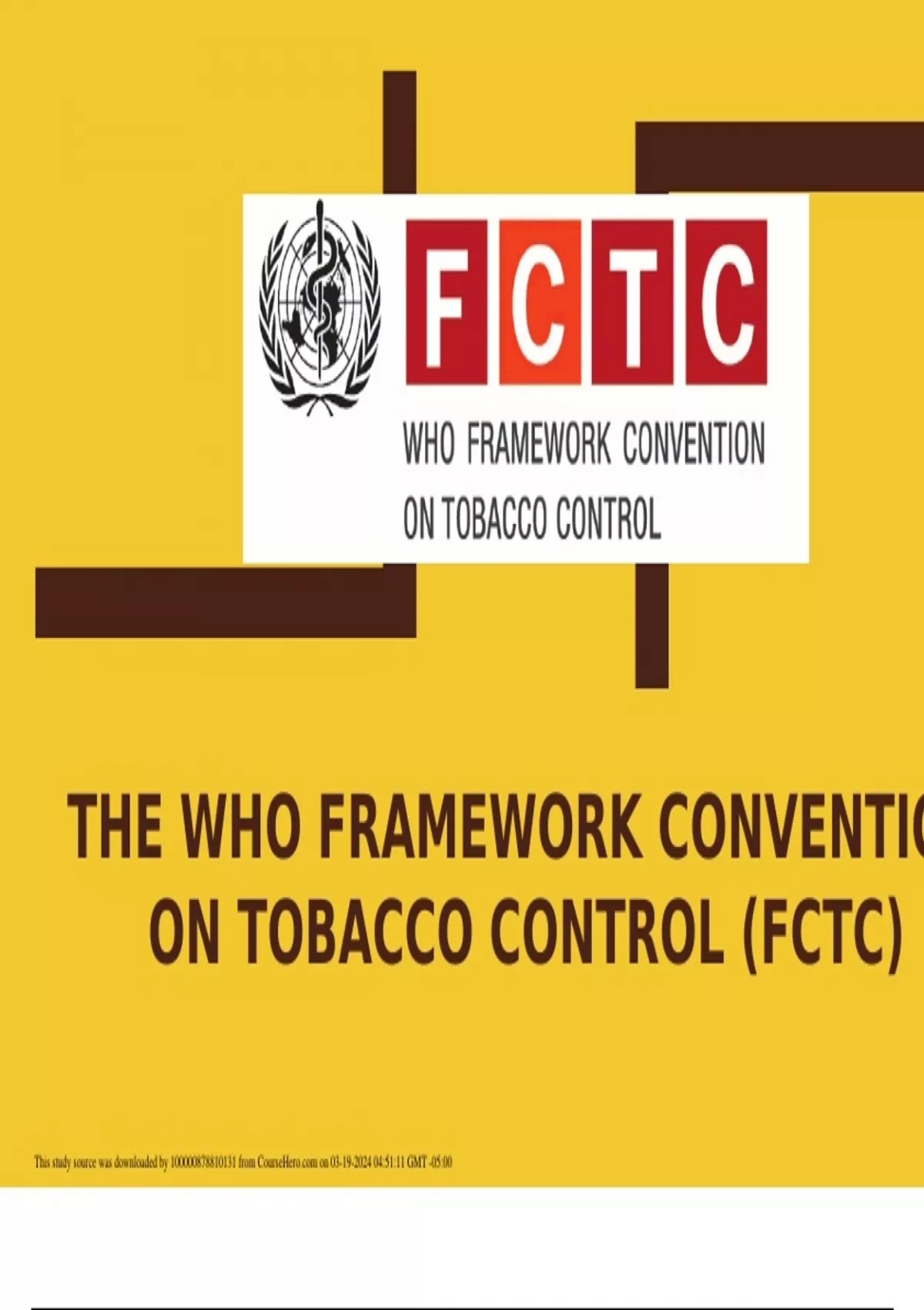 THE WHO FRAMEWORK CONVENTION ON TOBACCO CONTROL (FCTC) This study source was downloaded by from CourseH on :51:11 GMT -05:00 The Framework Convention on Tobacco Control (FCTC) ■ The worlds 1st modern-day global public health treaty ■ Also the first treaty negotiated under the herald of the World Health Organization (WHO) ■ The treaty was enacted in February 2005 ■ It was signed by 168 of the 192 WHO member states and more than 180 WHO member states have become parties to the convention This study source was downloaded by from CourseH on :51:11 GMT -05:00 FCTC ■ Provides an internationally coordinated response to combating the tobacco epidemic ■ Sets out specific steps for governments to address tobacco use – Adopt tax and price measures to reduce tobacco consumption – Ban tobacco advertising, promotion, and sponsorship – Create smoke-free work and public spaces – Put prominent health warnings on tobacco p