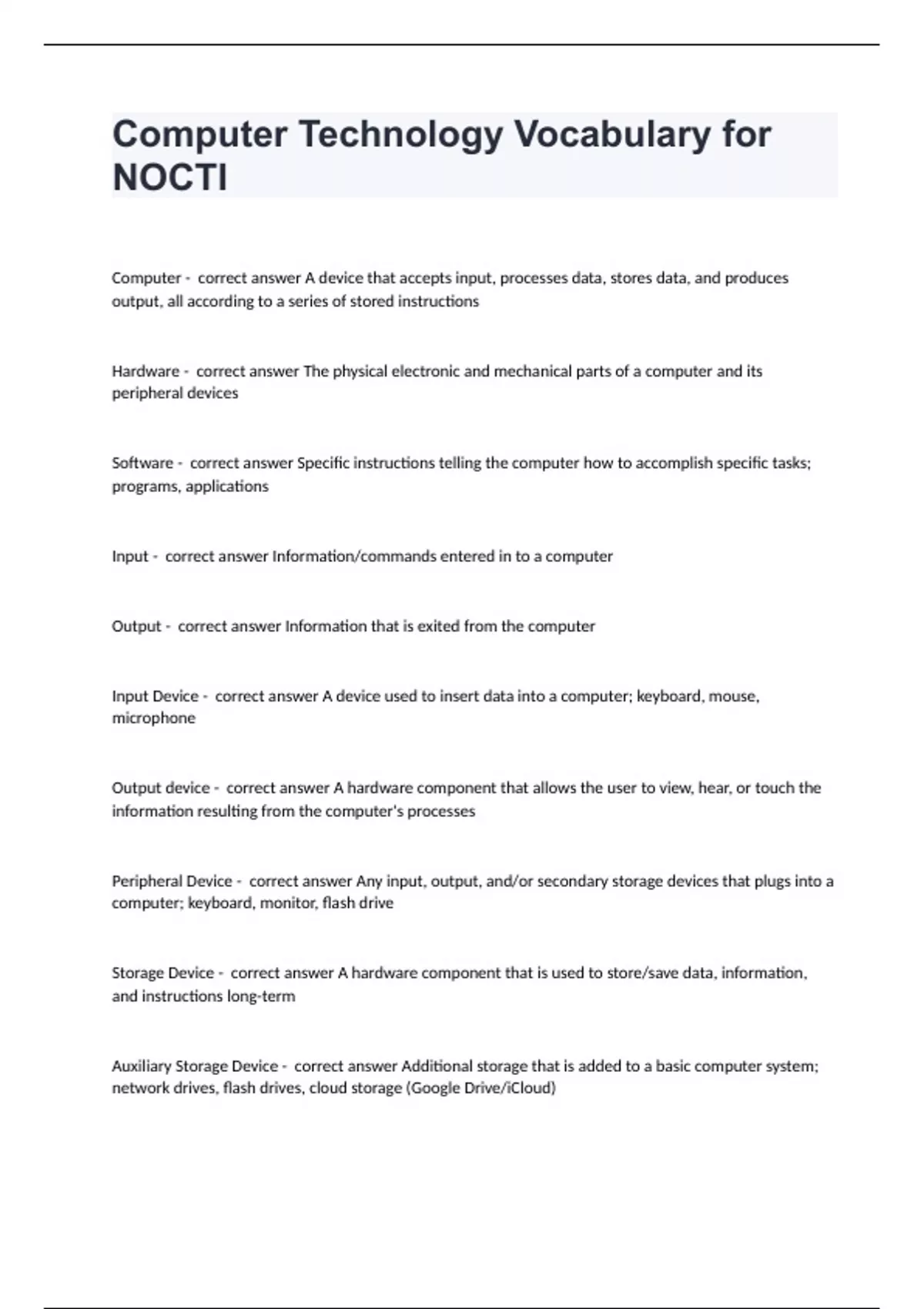 Computer Technology Vocabulary for NOCTI fully solved rated A+ 2024/2025 Computer - correct answer A device that accepts input, processes data, stores data, and produces output, all according to a series of stored instructions Hardware - correct answer The physical electronic and mechanical parts of a computer and its peripheral devices Software - correct answer Specific instructions telling the computer how to accomplish specific tasks; programs, applications Input - correct answer Information/commands entered in to a computer Output - correct answer Information that is exited from the computer Input Device - correct answer A device used to insert data into a computer; keyboard, mouse, microphone Output device - correct answer A hardware component that allows the user to view, hear, or touch the information resulting from the computer's processes Peripheral Device - correct answer Any input, output, and/or secondary storage devices that plugs into a computer; keyboard, monitor, flash drive Storage Device - correct answer A hardware component that is used to store/save data, information, and instructions long-term Auxiliary Storage Device - correct answer Additional storage that is added to a basic computer system; network drives, flash drives, cloud storage (Google Drive/iCloud) Supercomputer - correct answer The most powerful computer that contain extremely fast processors; capable of performing complex actions; processes data for millions of users Mainframe - correct answer An expensive and large computer that can execute multiple tasks at one time at very high speeds; designed to have hundreds of users Mini-computer - correct answer A multi-user computer that is designed to perform specific and/or repetitive tasks; usually has fewer than 100 users Server - correct answer A computer specifically designed to serve many different computers in a network by running specialized software and managing information File Server - correct answer A computer used to store data and software that is shared by several users; used by networks (especially social networks) Workstation - correct answer A high-end desktop computer with massive computing power; less expensive than a minicomputer; the most powerful desktop computers Personal Computer - correct answer A stationary/mobile computer with average capacity and processing power designed to be used by one person at a time Portable Electronic Device - correct answer A small handheld computer; includes smartphones, tablets, smart watches, and game consoles Data - correct answer Information that can be read, used, and manipulated by a computer Bit - correct answer A binary digit; a 0 or a 1; the smallest amount of data a computer can process/store Byte - correct answer Approximately 8 bits of processed data/storage space on a computer; one character on a computer Kilobyte - correct answer (KB) Approximately 1,000 bytes of processed data/storage space on a computer Megabyte - correct answer (MB) Approximately 1,000 kilobytes or 1 million bytes of processed data/storage space on a computer Gigabyte - correct answer (GB) Approximately 1,000 megabytes or 1 billion bytes of processed data/storage space on a computer Terabyte - correct answer (TB) Approximately 1 million megabytes or 1 trillion bytes of processed data/storage space on a computer Drive - correct answer A location on a network/in a computer that is set aside for the collection/storage of data Hard Drive - correct answer The main storage device in a computer Flash Drive - correct answer A small/portable version of a standard hard drive Backup - correct answer To create a duplicate copy of a file, disk, or drive CD-ROM - correct answer A compact disk with read only memory; an optical disk that contains data that cannot be changed CD-R - correct answer A compact disk that is recordable; an optical disk on which you can burn information but cannot erase it CD-RW - correct answer A compact disk that is rewritable; an optical disk that allows burning/writing, erasing, and rewriting DVD-ROM - correct answer A disk with read only memory; an optical disk that contains data that cannot be changed; the same physical size as a CD but with a much larger capacity