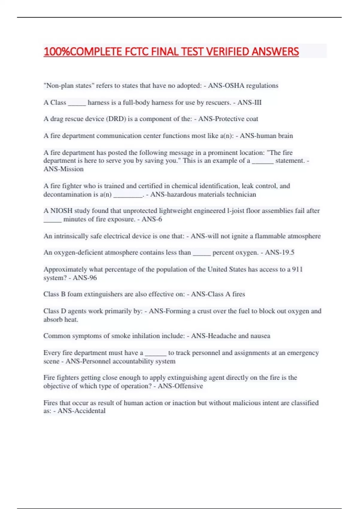 100%COMPLETE FCTC FINAL TEST VERIFIED ANSWERS "Non-plan states" refers to states that have no adopted: - ANS-OSHA regulations A Class _____ harness is a full-body harness for use by rescuers. - ANS-III A drag rescue device (DRD) is a component of the: - ANS-Protective coat A fire department communication center functions most like a(n): - ANS-human brain A fire department has posted the following message in a prominent location: "The fire department is here to serve you by saving you." This is an example of a ______ statement. - ANS-Mission A fire fighter who is trained and certified in chemical identification, leak control, and decontamination is a(n) ________. - ANS-hazardous materials technician A NIOSH study found that unprotected lightweight engineered l-joist floor assemblies fail after _____ minutes of fire exposure. - ANS-6 An intrinsically safe electrical device is one that: - ANS-will not ignite a flammable atmosphere An oxygen-deficient atmosphere contains less than _____ percent oxygen. - ANS-19.5 Approximately what percentage of the population of the United States has access to a 911 system? - ANS-96 Class B foam extinguishers are also effective on: - ANS-Class A fires Class D agents work primarily by: - ANS-Forming a crust over the fuel to block out oxygen and absorb heat. Common symptoms of smoke inhilation include: - ANS-Headache and nausea Every fire department must have a ______ to track personnel and assignments at an emergency scene - ANS-Personnel accountability system Fire fighters getting close enough to apply extinguishing agent directly on the fire is the objective of which type of operation? - ANS-Offensive Fires that occur as result of human action or inaction but without malicious intent are classified as: - ANS-Accidental For the purpose of extinguisher selection and placement, what is an example of a light hazard environment? - ANS-Classroom For whom should fire fighters consider that they work? - ANS-The tax-paying citizens From a doorway, a crew directs a hose