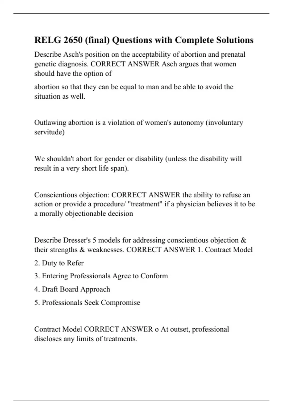 Describe Asch's position on the acceptability of abortion and prenatal genetic diagnosis. CORRECT ANSWER Asch argues that women should have the option of abortion so that they can be equal to man and be able to avoid the situation as well. Outlawing abortion is a violation of women's autonomy (involuntary servitude) We shouldn't abort for gender or disability (unless the disability will result in a very short life span). Conscientious objection: CORRECT ANSWER the ability to refuse an action or provide a procedure/ "treatment" if a physician believes it to be a morally objectionable decision Describe Dresser's 5 models for addressing conscientious objection & their strengths & weaknesses. CORRECT ANSWER 1. Contract Model 2. Duty to Refer 3. Entering Professionals Agree to Conform 4. Draft Board Approach 5. Professionals Seek Compromise Contract Model CORRECT ANSWER o At outset, professional discloses any limits of treatments. o If a patient requires a service th