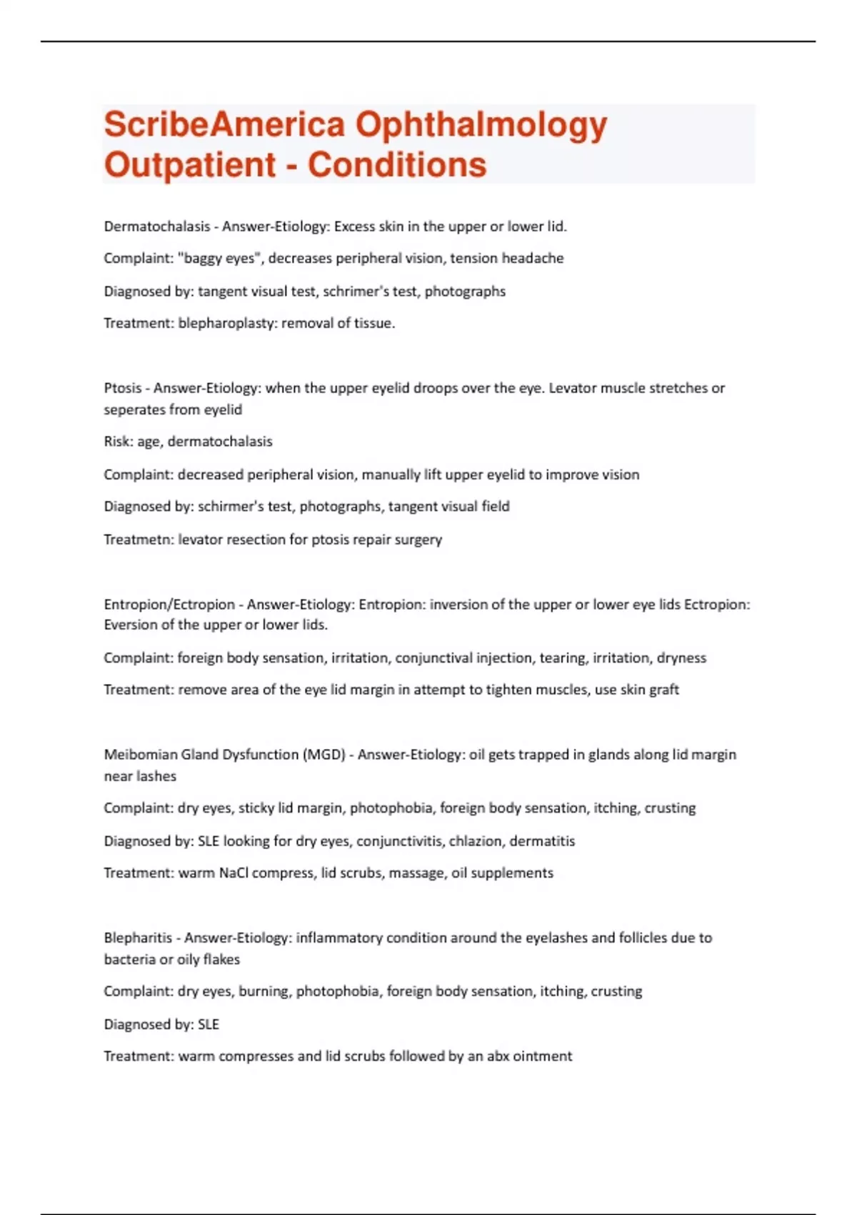 Dermatochalasis - Answer-Etiology: Excess skin in the upper or lower lid. Complaint: "baggy eyes", decreases peripheral vision, tension headache Diagnosed by: tangent visual test, schrimer's test, photographs Treatment: blepharoplasty: removal of tissue. Ptosis - Answer-Etiology: when the upper eyelid droops over the eye. Levator muscle stretches or seperates from eyelid Risk: age, dermatochalasis Complaint: decreased peripheral vision, manually lift upper eyelid to improve vision Diagnosed by: schirmer's test, photographs, tangent visual field Treatmetn: levator resection for ptosis repair surgery Entropion/Ectropion - Answer-Etiology: Entropion: inversion of the upper or lower eye lids Ectropion: Eversion of the upper or lower lids. Complaint: foreign body sensation, irritation, conjunctival injection, tearing, irritation, dryness Treatment: remove area of the eye lid margin in attempt to tighten muscles, use skin graft Meibomian Gland Dysfunction (MGD) - Answer-Etiology: oil gets trapped in glands along lid margin near lashes Complaint: dry eyes, sticky lid margin, photophobia, foreign body sensation, itching, crusting Diagnosed by: SLE looking for dry eyes, conjunctivitis, chlazion, dermatitis Treatment: warm NaCl compress, lid scrubs, massage, oil supplements Blepharitis - Answer-Etiology: inflammatory condition around the eyelashes and follicles due to bacteria or oily flakes Complaint: dry eyes, burning, photophobia, foreign body sensation, itching, crusting Diagnosed by: SLE Treatment: warm compresses and lid scrubs followed by an abx ointmentHordeolum - Answer-Etiology: sty, usually caused by infection of an eyelash follicle, painful and localizes to an eyelid margin Complaint: hyperemia, edema, pain Risk: contact lens, leaving eye makeup, blepharitis, rosacea Treatment: warm sodium chloride compresses Chalazion - Answer-Etiology: noninfectious obstruction of meibomian gland Complaint: eyelid hyperemia, edema, pain, becomes small nontender nodule Diagnosed by: swollen cyst to the eyelid Treatment: removal/excision or I&D Dry Eye syndrome (DES) or K Sicca - Answer-Etiology: tear duct dysfunction Complaint: dry eyes, chronic irritation and dryness, foreign body sensation Diagnosed by: schrimer's test, dry eye survey Risk: contact lens overuse, Sjogren's syndrome Treatmetn: OTC lubrication: refresh, restasis, artificial tears, punctal plugs