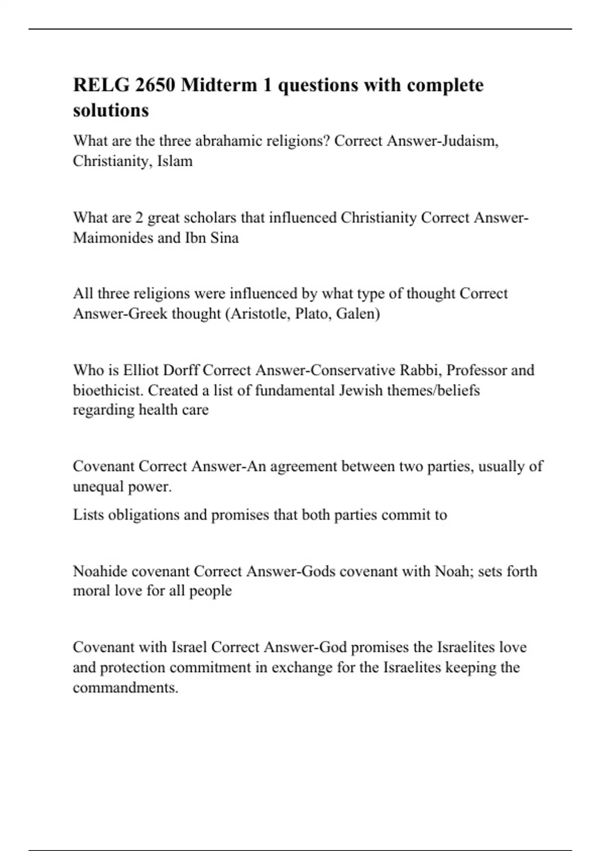 What are the three abrahamic religions? Correct Answer-Judaism, Christianity, Islam What are 2 great scholars that influenced Christianity Correct Answer-Maimonides and Ibn Sina All three religions were influenced by what type of thought Correct Answer-Greek thought (Aristotle, Plato, Galen) Who is Elliot Dorff Correct Answer-Conservative Rabbi, Professor and bioethicist. Created a list of fundamental Jewish themes/beliefs regarding health care Covenant Correct Answer-An agreement between two parties, usually of unequal power. Lists obligations and promises that both parties commit to Noahide covenant Correct Answer-Gods covenant with Noah; sets forth moral love for all people Covenant with Israel Correct Answer-God promises the Israelites love and protection commitment in exchange for the Israelites keeping the commandments. Five books of the torah Correct Answe