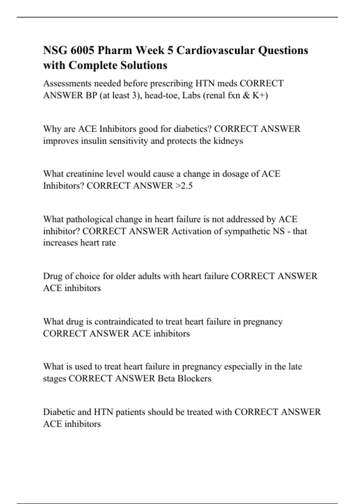 Assessments needed before prescribing HTN meds CORRECT ANSWER BP (at least 3), head-toe, Labs (renal fxn & K+) Why are ACE Inhibitors good for diabetics? CORRECT ANSWER improves insulin sensitivity and protects the kidneys What creatinine level would cause a change in dosage of ACE Inhibitors? CORRECT ANSWER >2.5 What pathological change in heart failure is not addressed by ACE inhibitor? CORRECT ANSWER Activation of sympathetic NS - that increases heart rate Drug of choice for older adults with heart failure CORRECT ANSWER ACE inhibitors What drug is contraindicated to treat heart failure in pregnancy CORRECT ANSWER ACE inhibitors What is used to treat heart failure in pregnancy especially in the late stages CORRECT ANSWER Beta Blockers Diabetic and HTN patients should be treated with CORRECT ANSWER ACE inhibitors