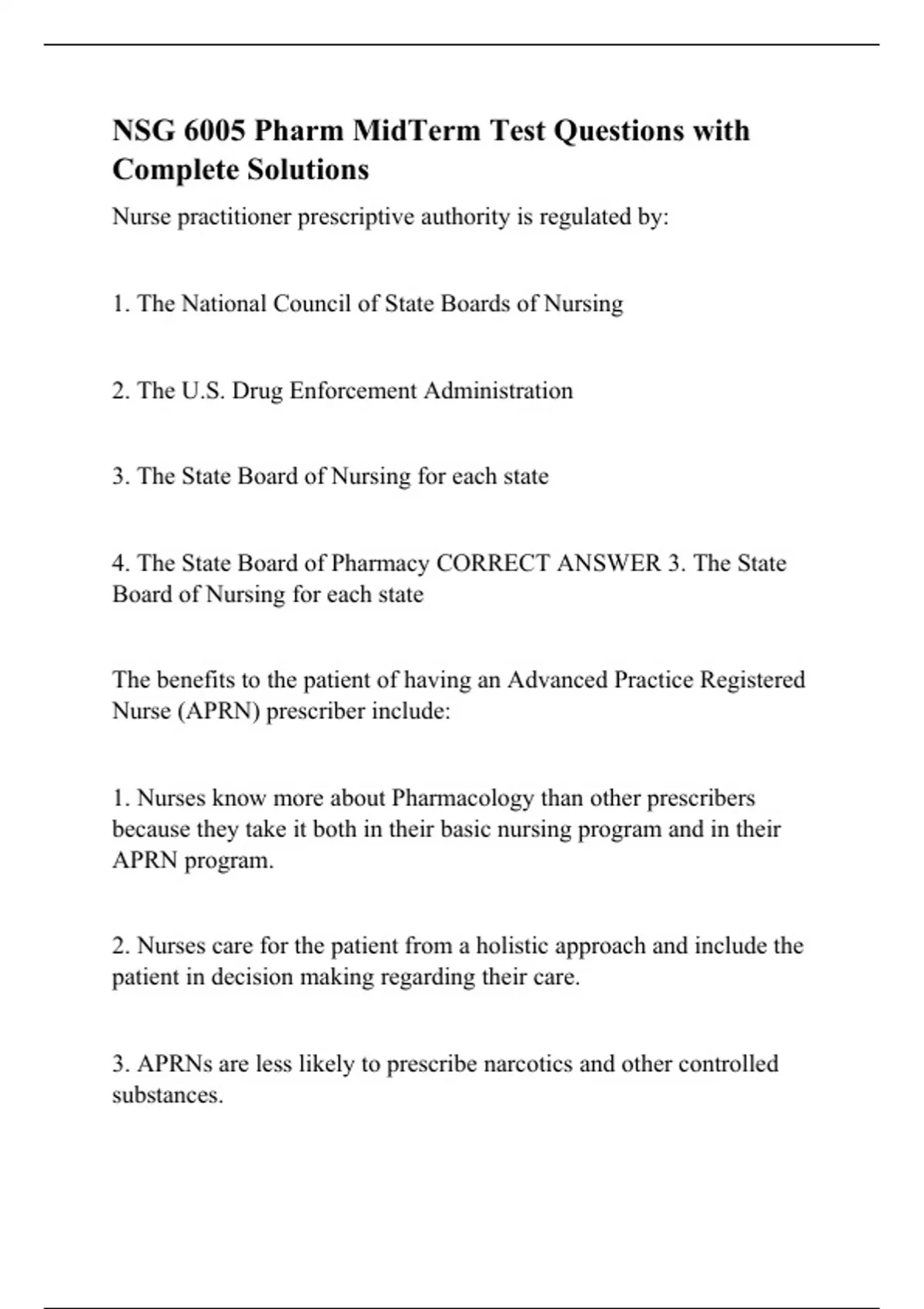 Nurse practitioner prescriptive authority is regulated by: 1. The National Council of State Boards of Nursing 2. The U.S. Drug Enforcement Administration 3. The State Board of Nursing for each state 4. The State Board of Pharmacy CORRECT ANSWER 3. The State Board of Nursing for each state The benefits to the patient of having an Advanced Practice Registered Nurse (APRN) prescriber include: 1. Nurses know more about Pharmacology than other prescribers because they take it both in their basic nursing program and in their APRN program. 2. Nurses care for the patient from a holistic approach and include the patient in decision making regarding their care.