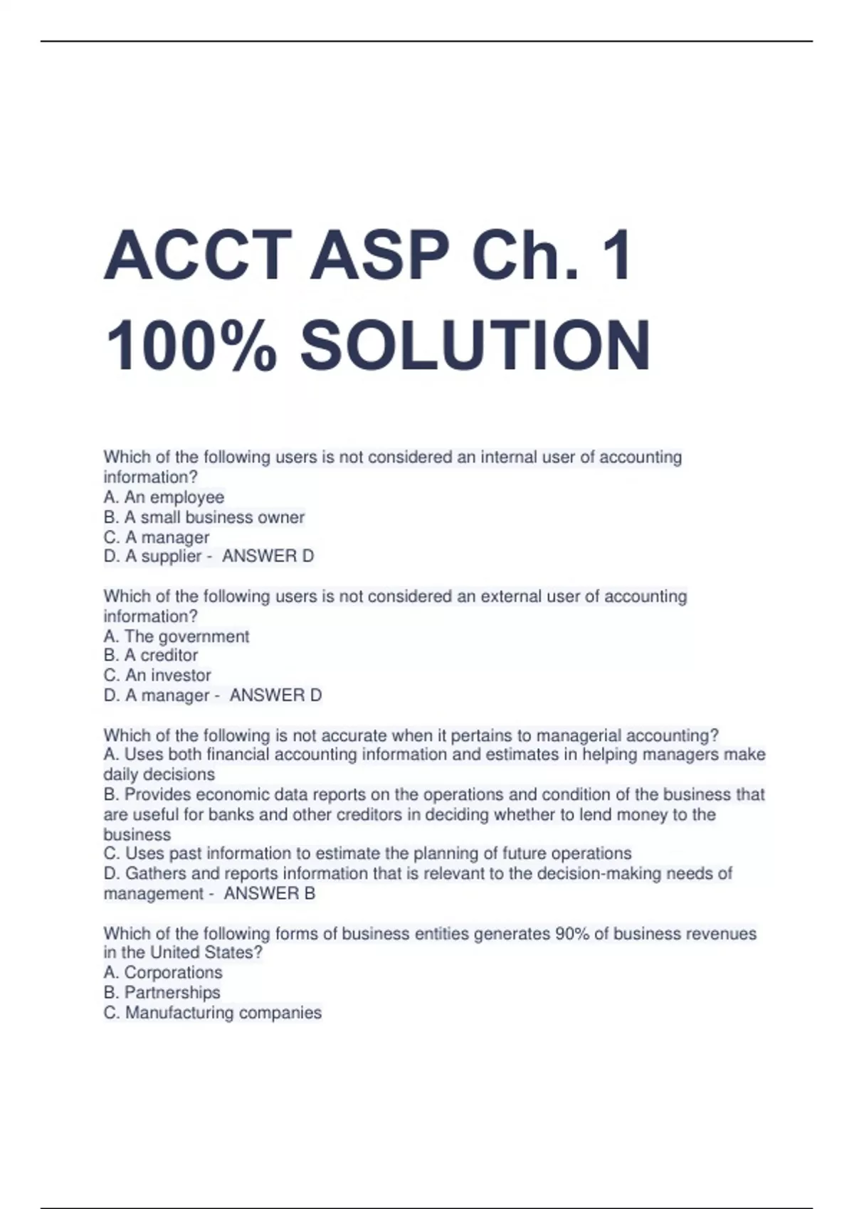 ACCT ASP Ch. 1 100% SOLUTION Which of the following users is not considered an internal user of accounting information? A. An employee B. A small business owner C. A manager D. A supplier - ANSWER D Which of the following users is not considered an external user of accounting information? A. The government B. A creditor C. An investor D. A manager - ANSWER D Which of the following is not accurate when it pertains to managerial accounting? A. Uses both financial accounting information and estimates in helping managers make daily decisions B. Provides economic data reports on the operations and condition of the business that are useful for banks and other creditors in deciding whether to lend money to the business C. Uses past information to estimate the planning of future operations D. Gathers and reports information that is relevant to the decision-making needs of management - ANSWER B Which of the following forms of business entities generates 90% of business revenues in the United States? A. Corporations B. Partnerships C. Manufacturing companies D. Proprietorships - ANSWER