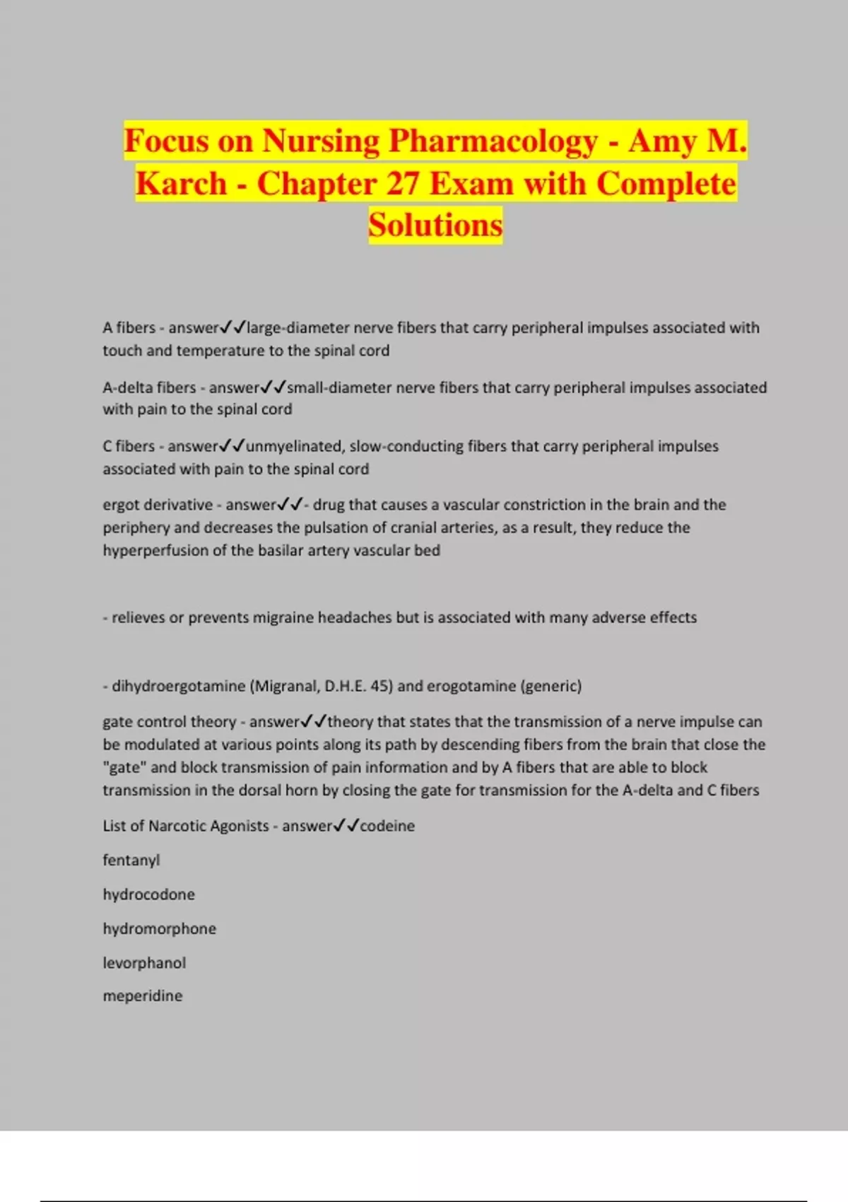 Focus on Nursing Pharmacology - Amy M. Karch - Chapter 27 Exam with Complete Solutions A fibers - answerlarge-diameter nerve fibers that carry peripheral impulses associated with touch and temperature to the spinal cord A-delta fibers - answersmall-diameter nerve fibers that carry peripheral impulses associated with pain to the spinal cord C fibers - answerunmyelinated, slow-conducting fibers that carry peripheral impulses associated with pain to the spinal cord ergot derivative - answer- drug that causes a vascular constriction in the brain and the periphery and decreases the pulsation of cranial arteries, as a result, they reduce the hyperperfusion of the basilar artery vascular bed - relieves or prevents migraine headaches but is associated with many adverse effects - dihydroergotamine (Migranal, D.H.E. 45) and erogotamine (generic) gate control theory - answertheory that states that the transmission of a nerve impulse can be modulated at various points along its path by descending fibers from the brain that close the "gate" and block transmission of pain information and by A fibers that are able to block transmission in the dorsal horn by closing the gate for transmission for the A-delta and C fibers List of Narcotic Agonists - answercodeine fentanyl hydrocodone hydromorphone levorphanol meperidine methadone morphine - (PROTOTYPE) opium oxycodone oxymorphone propoxyphene remifentanil sufentanil tramadol List of Narcotic Agonists-Antagonists - answerbuprenorphine butorphanol nalbuphine pentazocine - (PROTOTYPE) List of Narcotic Antagonists - answernalmefene naloxone - (PROTOTYPE) naltrexone Antimigraine Agents - List of Ergot Derivatives - answerdihydroergotamine ergotamine - (PROTOTYPE) Antimigraine Agents - List of Triptans - answeralmotriptan eletriptan frovatriptan naratriptan rizatriptan sumatriptan - (PROTOTYPE) zolmitriptan migraine headache - answerheadache characterized by severe unilateral, pulsating head pain associated with systemic effects, including GI upset and sensitization to light and sound; related to a hyperperfusion of the brain from arterial dilation narcotics - answer-drugs, originally derived from opium plant, that react with specific opioid receptors throughout the body - they bind to opioid receptors to relieve pain and promote feelings of well-being or euphoria narcotic agonists - answer-drugs that react at opioid receptor sites to stimulate the effects of the receptors throughout the body to cause analgesia, sedation, and euphoria -classified as controlled substances due to the potential for the development of physical dependence while taking this drug - the degree of control is determined by the relative ability of each drug to cause physical dependence - act at specific receptor sites in the CNS to produce analgesia, sedation, and a sense of well- being - also used as antitussives and as adjuncts to general anesthesia to produce rapid analgesia, sedation, and respiratory depression narcotic agonists-antagonists - answerdrugs that react at some opioid receptor sites to stimulate their activity and at other opioid receptor sites to block activity narcotic antagonists - answerdrugs that block the opioid receptor sites; used to counteract the effects of narcotics or to treat an overdose of narcotics opioid receptors - answer-receptor sites on nerves that react with endorphins and enkephalins (naturally occurring peptides), which are receptive to narcotic drugs - found in the CNS, on nerves in the periphery, and on cells in the GI tract. - in the brainstem, it helps to control BP, pupil diameter, GI secretions, and the chemoreceptor trigger zone (CTZ) that regulates N&V, cough, adn respiration -in the spinal cord and thalamus, it helps to integrate and relate incoming information about pain - in the hypothalamus, stimulation of these receptors may interrelate the endocrine and neural responses to pain -in the limbric system, these receptors incorporate emotional aspects of pain and response to pain - at the peripheral nerve sites, they may block the release of neurotransmitters that are related to pain and inflammation pain - answera sensory and emotional experience associated with actual or potential tissue damage spinothalamic tract - answernerve pathway from the spine to the thalamus along which pain impulses are carried to the brain triptan - answer-selective serotonin receptor blocker that causes a vasular constriction of cranial nerves; used to treat acute migraine attacks. - not associated with the vascular and GI effects of the ergot derivatives -the triptan of choice for a particular patient depends on personal experience and other preexisting medical conditions - almotriptan (Axert), eletriptan (Relpax), frovatriptan (Frova), naratriptan (Amerge), rizatriptan (Maxalt, Maxalt-MLT), sumatriptan (Imitrex), and zolmitriptan (Zomig, Zomig-ZMT) What are the two major types of drugs involved in the management of severe pain? - answeropium derivatives- used to treat many types of pain antimigraine drugs - reserved for the treatment of migraine headache What about PAIN? - answer- it is an unpleasant sensation and emotional experience. -it is a subjective experience - physiological processe