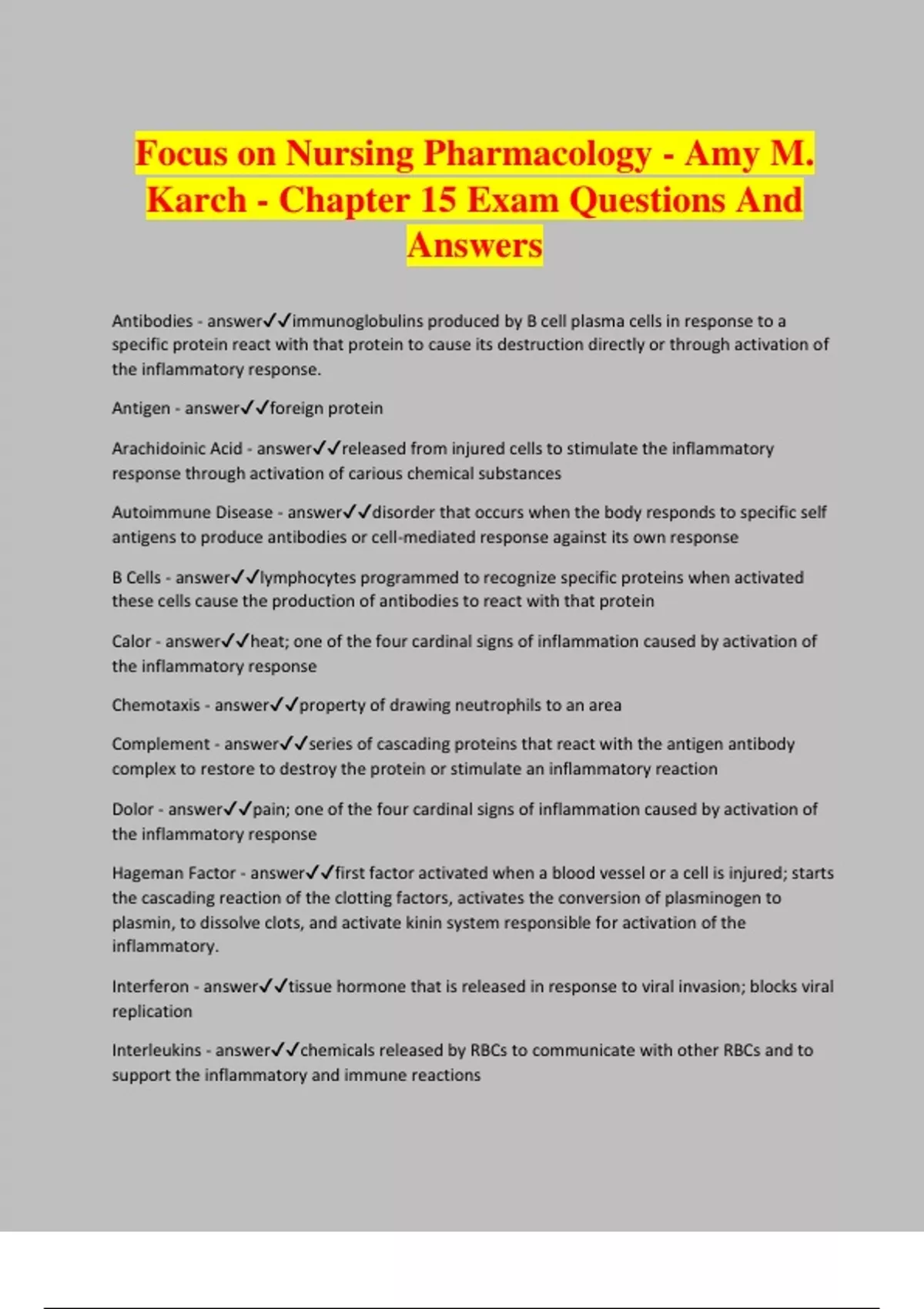 Focus on Nursing Pharmacology - Amy M. Karch - Chapter 15 Exam Questions And Answers Antibodies - answerimmunoglobulins produced by B cell plasma cells in response to a specific protein react with that protein to cause its destruction directly or through activation of the inflammatory response. Antigen - answerforeign protein Arachidoinic Acid - answerreleased from injured cells to stimulate the inflammatory response through activation of carious chemical substances Autoimmune Disease - answerdisorder that occurs when the body responds to specific self antigens to produce antibodies or cell-mediated response against its own response B Cells - answerlymphocytes programmed to recognize specific proteins when activated these cells cause the production of antibodies to react with that protein Calor - answerheat; one of the four cardinal signs of inflammation caused by activation of the inflammatory response Chemotaxis - answerproperty of drawing neutrophils to an area Complement - answerseries of cascading proteins that react with the antigen antibody complex to restore to destroy the protein or stimulate an inflammatory reaction Dolor - answerpain; one of the four cardinal signs of inflammation caused by activation of the inflammatory response Hageman Factor - answerfirst factor activated when a blood vessel or a cell is injured; starts the cascading reaction of the clotting factors, activates the conversion of plasminogen to plasmin, to dissolve clots, and activate kinin system responsible for activation of the inflammatory. Interferon - answertissue hormone that is released in response to viral invasion; blocks viral replication Interleukins - answerchemicals released by RBCs to communicate with other RBCs and to support the inflammatory and immune reactions