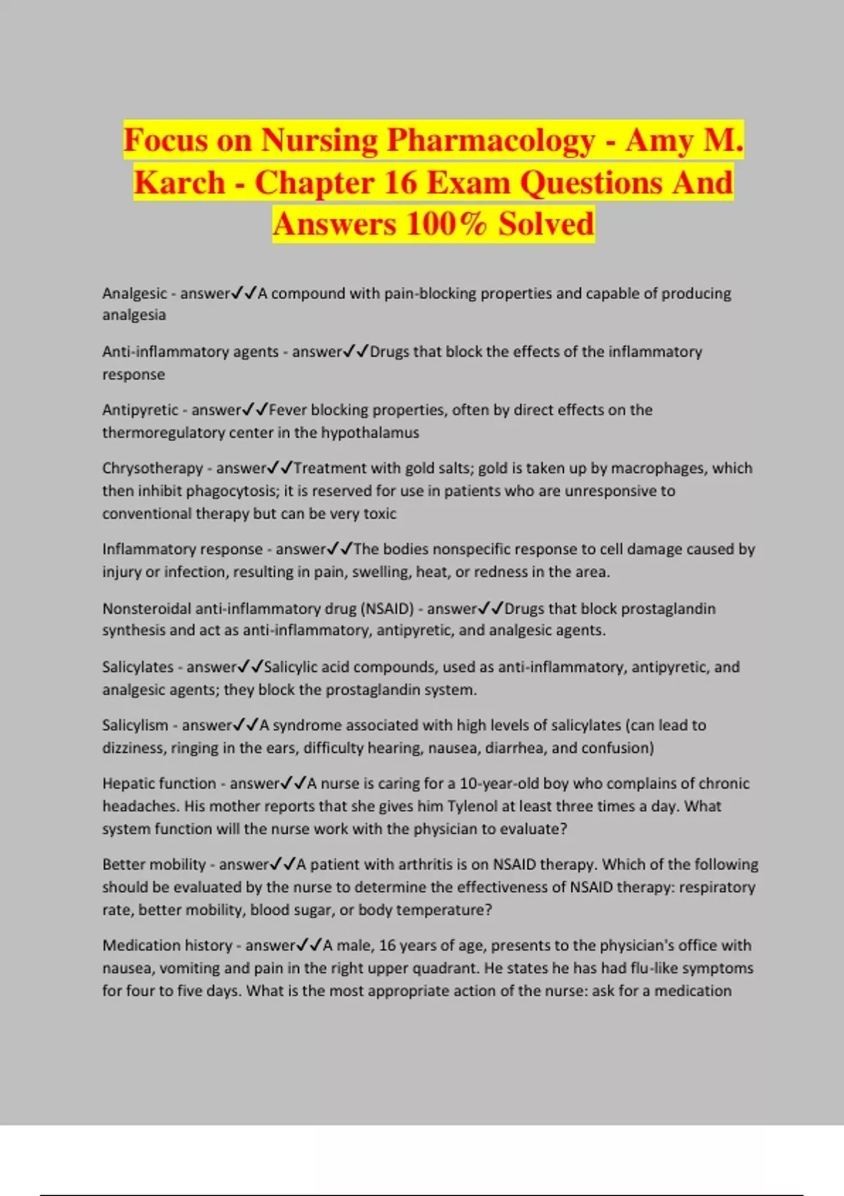 Focus on Nursing Pharmacology - Amy M. Karch - Chapter 16 Exam Questions And Answers 100% Solved Analgesic - answerA compound with pain-blocking properties and capable of producing analgesia Anti-inflammatory agents - answerDrugs that block the effects of the inflammatory response Antipyretic - answerFever blocking properties, often by direct effects on the thermoregulatory center in the hypothalamus Chrysotherapy - answerTreatment with gold salts; gold is taken up by macrophages, which then inhibit phagocytosis; it is reserved for use in patients who are unresponsive to conventional therapy but can be very toxic Inflammatory response - answerThe bodies nonspecific response to cell damage caused by injury or infection, resulting in pain, swelling, heat, or redness in the area. Nonsteroidal anti-inflammatory drug (NSAID) - answerDrugs that block prostaglandin synthesis and act as anti-inflammatory, antipyretic, and analgesic agents. Salicylates - answerSalicylic acid compounds, used as anti-inflammatory, antipyretic, and analgesic agents; they block the prostaglandin system. Salicylism - answerA syndrome associated with high levels of salicylates (can lead to dizziness, ringing in the ears, difficulty hearing, nausea, diarrhea, and confusion) Hepatic function - answerA nurse is caring for a 10-year-old boy who complains of chronic headaches. His mother reports that she gives him Tylenol at least three times a day. What system function will the nurse work with the physician to evaluate? Better mobility - answerA patient with arthritis is on NSAID therapy. Which of the following should be evaluated by the nurse to determine the effectiveness of NSAID therapy: respiratory rate, better mobility, blood sugar, or body temperature? Medication history - answerA male, 16 years of age, presents to the physician's office with nausea, vomiting and pain in the right upper quadrant. He states he has had flu-like symptoms for four to five days. What is the most appropriate action of the nurse: ask for a medication