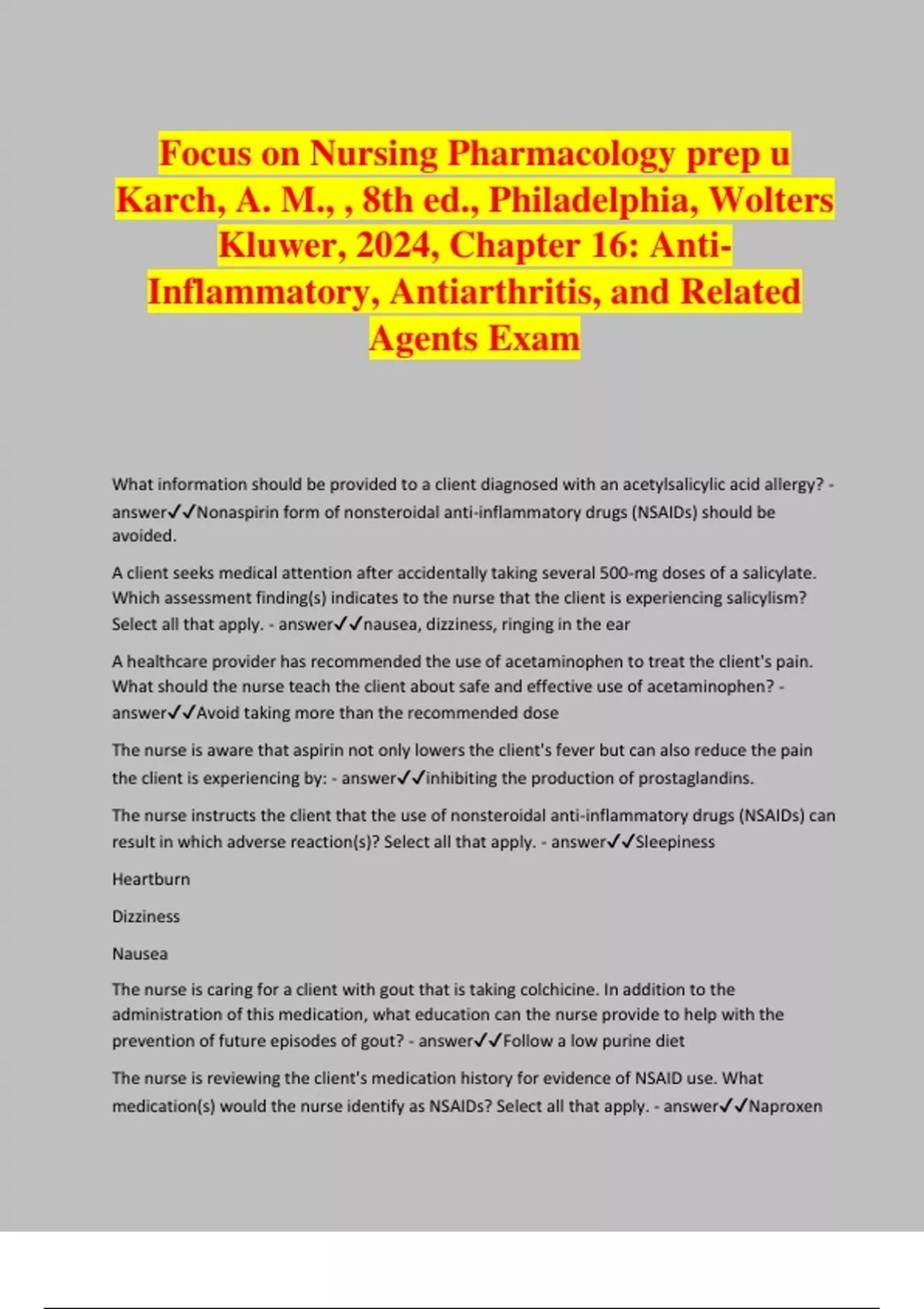 Focus on Nursing Pharmacology prep u Karch, A. M., , 8th ed., Philadelphia, Wolters Kluwer, 2024, Chapter 16: Anti- Inflammatory, Antiarthritis, and Related Agents Exam What information should be provided to a client diagnosed with an acetylsalicylic acid allergy? - answerNonaspirin form of nonsteroidal anti-inflammatory drugs (NSAIDs) should be avoided. A client seeks medical attention after accidentally taking several 500-mg doses of a salicylate. Which assessment finding(s) indicates to the nurse that the client is experiencing salicylism? Select all that apply. - answernausea, dizziness, ringing in the ear A healthcare provider has recommended the use of acetaminophen to treat the client's pain. What should the nurse teach the client about safe and effective use of acetaminophen? - answerAvoid taking more than the recommended dose The nurse is aware that aspirin not only lowers the client's fever but can also reduce the pain the client is experiencing by: - answerinhibiting the production of prostaglandins. The nurse instructs the client that the use of nonsteroidal anti-inflammatory drugs (NSAIDs) can result in which adverse reaction(s)? Select all that apply. - answerSleepiness Heartburn Dizziness Nausea The nurse is caring for a client with gout that is taking colchicine. In addition to the administration of this medication, what education can the nurse provide to help with the prevention of future episodes of gout? - answerFollow a low purine diet