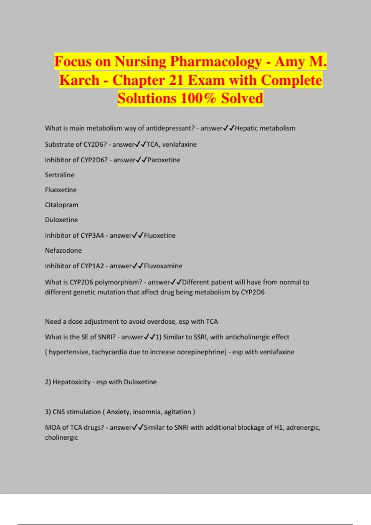 Focus on Nursing Pharmacology - Amy M. Karch - Chapter 21 Exam with Complete Solutions 100% Solved What is main metabolism way of antidepressant? - answerHepatic metabolism Substrate of CY2D6? - answerTCA, venlafaxine Inhibitor of CYP2D6? - answerParoxetine Sertraline Fluoxetine Citalopram Duloxetine Inhibitor of CYP3A4 - answerFluoxetine Nefazodone Inhibitor of CYP1A2 - answerFluvoxamine What is CYP2D6 polymorphism? - answerDifferent patient will have from normal to different genetic mutation that affect drug being metabolism by CYP2D6 Need a dose adjustment to avoid overdose, esp with TCA What is the SE of SNRI? - answer1) Similar to SSRI, with anticholinergic effect ( hypertensive, tachycardia due to increase norepinephrine) - esp with venlafaxine 2) Hepatoxicity - esp with Duloxetine 3) CNS stimulation ( Anxiety, insomnia, agitation ) MOA of TCA drugs? - answerSimilar to SNRI with additional blockage of H1, adrenergic, cholinergic