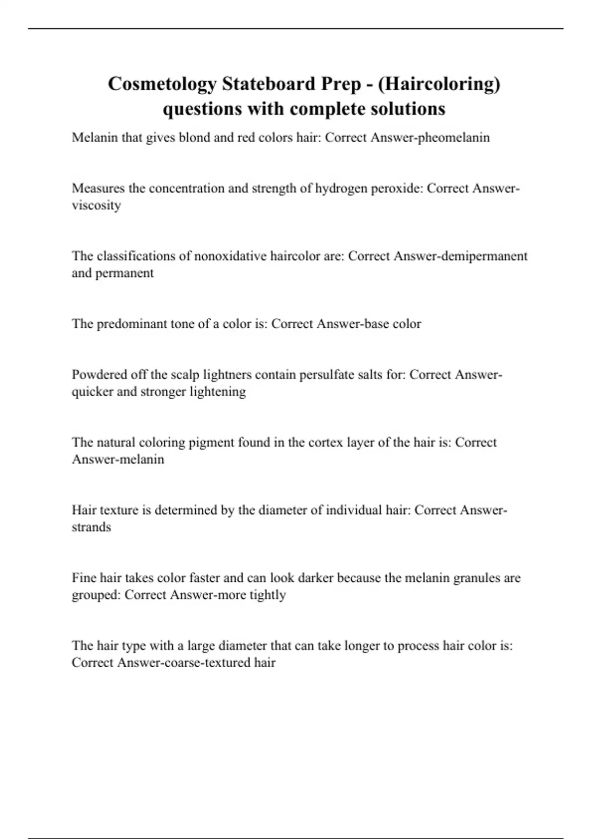 Cosmetology Stateboard Prep - (Haircoloring) questions with complete solutions