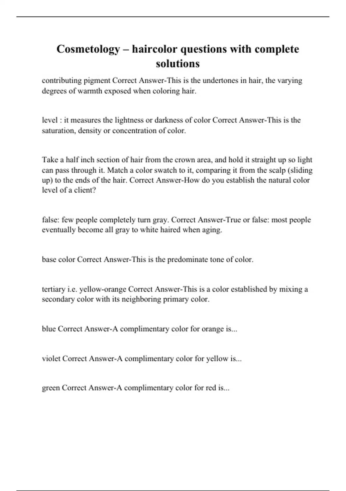 Cosmetology – haircolor questions with complete solutions