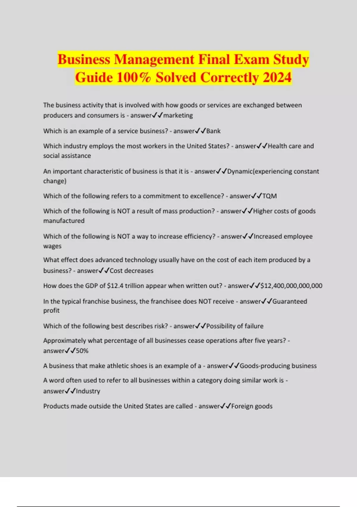 Business Management Final Exam Study Guide 100% Solved Correctly 2024 The business activity that is involved with how goods or services are exchanged between producers and consumers is - answermarketing Which is an example of a service business? - answerBank Which industry employs the most workers in the United States? - answerHealth care and social assistance An important characteristic of business is that it is - answerDynamic(experiencing constant change) Which of the following refers to a commitment to excellence? - answerTQM Which of the following is NOT a result of mass production? - answerHigher costs of goods manufactured Which of the following is NOT a way to increase efficiency? - answerIncreased employee wages What effect does advanced technology usually have on the cost of each item produced by a business? - answerCost decreases How does the GDP of $12.4 trillion appear when written out? - answer$12,400,000,000,000 In the typical franchise business, the franchisee does NOT receive - answerGuaranteed profit Which of the following best describes risk? - answerPossibility of failure Approximately what percentage of all businesses cease operations after five years? - answer50% A business that make athletic shoes is an example of a - answerGoods-producing business A word often used to refer to all businesses within a category doing similar work is - answerIndustry Products made outside the United States are called - answerForeign goods The north cventral and northeastern states where manufacturing firms once dominated are known as the - answerRust belt The size of the American Labor force is around - answer150 million In 2015, the labor participation rate for women was about - answer60% Over the years, the labor participation rate for men has - answerdropped slightly With improved technology in recent years, the demand for skilled workers has - answerincreased Which statement about the workforce is INCORRECT? - answerWages tend to be lower in jobs that employ lots of men than in job held primarily by women Which of the following is NOT a factor in determining comparatable worth? - answerRequiring males or females for a job Which of the following is an INCORRECT statement regarding what employers are doing to help attract and retain competent workers? - answerTrain workers to like repetitive jobs Which statement about the human factor in business is FALSE? - answerEmployees do not want to work in teams Which statement is INCORRECT about ethical issues? - answerNotions of what is right and wrong do not change over time Which method is likely to be the least costly and risky way to expand abroad? - answerExporting Two or more firms sharing the costs of doing business in foreign countries and also sharing the profits are - answerJoint ventures If the United States set a tariff of 15 percent on $150 cameras that are made in Germany, the cost of the camera in the United States will rise to - answer$172.50 How do tariffs affect the price of foreign goods? - answerPrices increase Nontariff barriers - answerProtect domestic producers In a high-context culture such as Japan, communication would NOT likely be - answerDirect If a U.S. company overproduces, the best way to dispose of its surplus goods profitably is to - answersell the surplus goods abroad