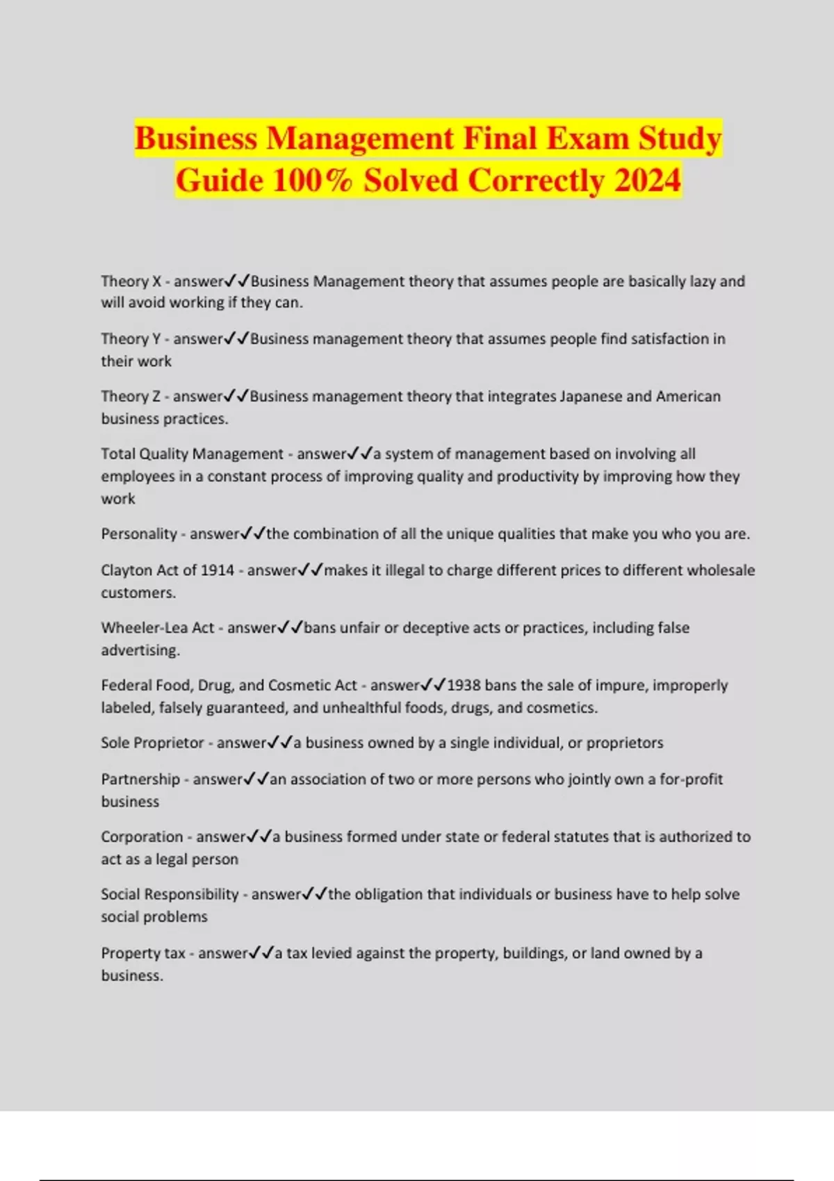 Business Management Final Exam Study Guide 100% Solved Correctly 2024