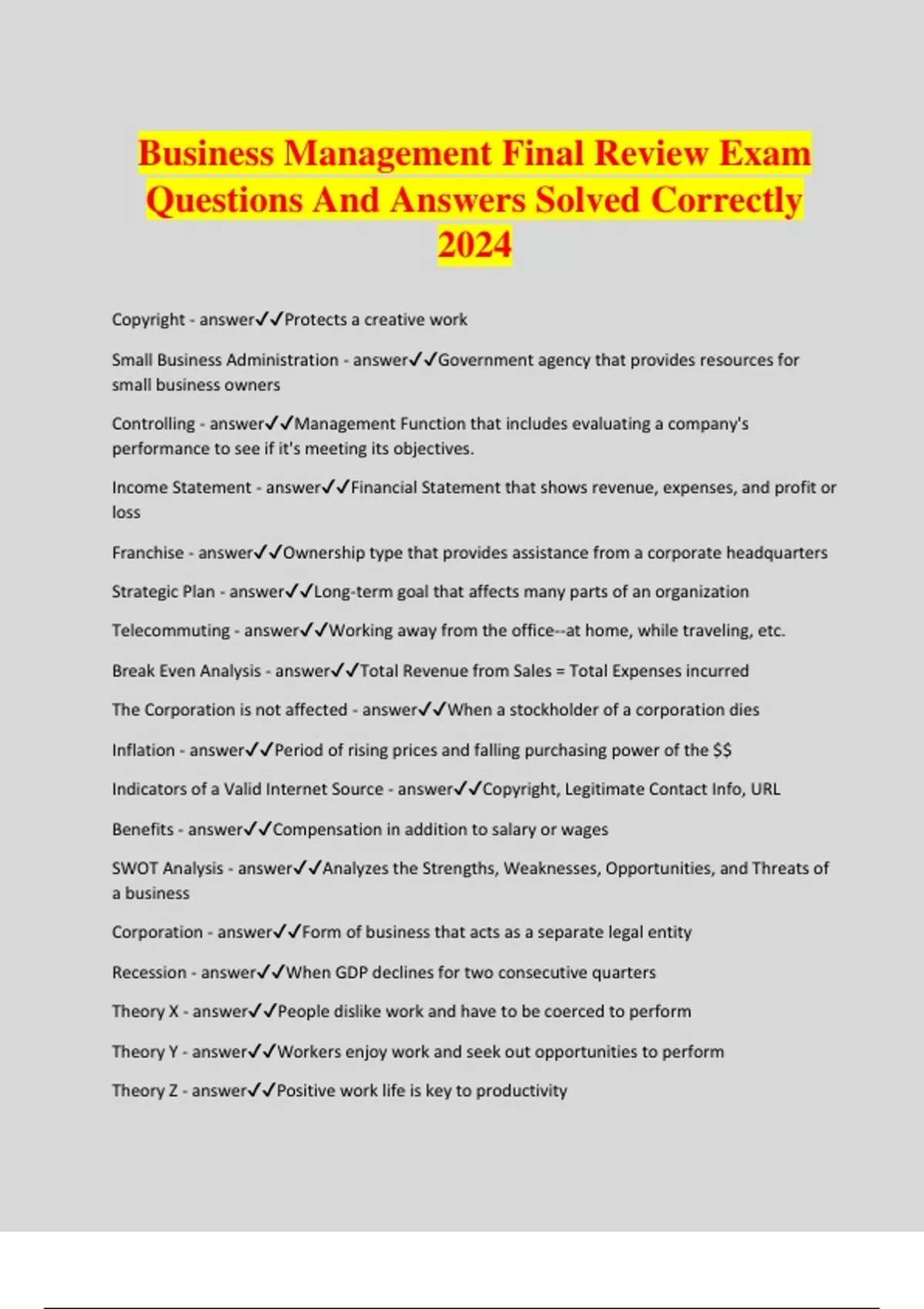 Business Management Final Review Exam Questions And Answers Solved Correctly 2024 Copyright - answerProtects a creative work Small Business Administration - answerGovernment agency that provides resources for small business owners Controlling - answerManagement Function that includes evaluating a company's performance to see if it's meeting its objectives. Income Statement - answerFinancial Statement that shows revenue, expenses, and profit or loss Franchise - answerOwnership type that provides assistance from a corporate headquarters Strategic Plan - answerLong-term goal that affects many parts of an organization Telecommuting - answerWorking away from the office--at home, while traveling, etc. Break Even Analysis - answerTotal Revenue from Sales = Total Expenses incurred The Corporation is not affected - answerWhen a stockholder of a corporation dies Inflation - answerPeriod of rising prices and falling purchasing power of the $$ Indicators of a Valid Internet Source - answerCopyright, Legitimate Contact Info, URL Benefits - answerCompensation in addition to salary or wages SWOT Analysis - answerAnalyzes the Strengths, Weaknesses, Opportunities, and Threats of a business Corporation - answerForm of business that acts as a separate legal entity