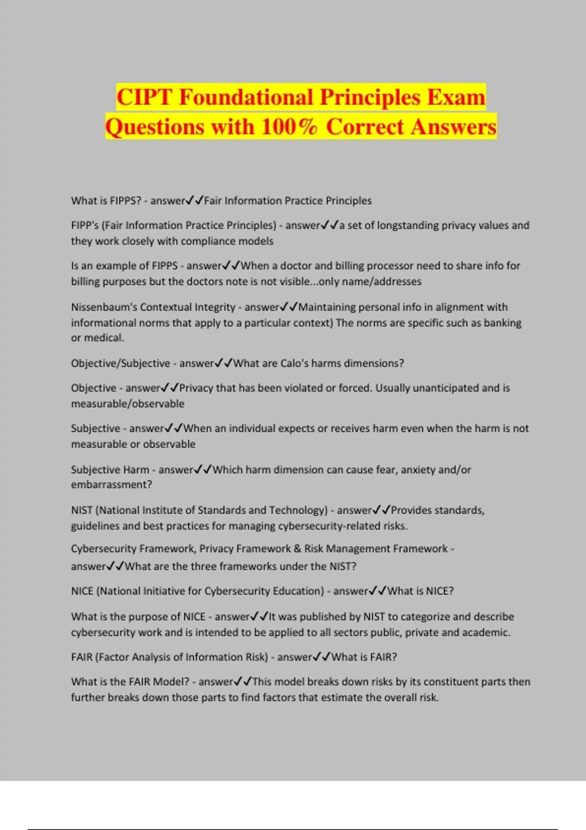 CIPT Foundational Principles Exam Questions with 100% Correct Answers What is FIPPS? - answerFair Information Practice Principles FIPP's (Fair Information Practice Principles) - answera set of longstanding privacy values and they work closely with compliance models Is an example of FIPPS - answerWhen a doctor and billing processor need to share info for billing purposes but the doctors note is not visible...only name/addresses Nissenbaum's Contextual Integrity - answerMaintaining personal info in alignment with informational norms that apply to a particular context) The norms are specific such as banking or medical. Objective/Subjective - answerWhat are Calo's harms dimensions? Objective - answerPrivacy that has been violated or forced. Usually unanticipated and is measurable/observable Subjective - answerWhen an individual expects or receives harm even when the harm is not measurable or observable Subjective Harm - answerWhich harm dimension can cause fear, anxiety and/or embarrassment? NIST (National Institute of Standards and Technology) - answerProvides standards, guidelines and best practices for managing cybersecurity-related risks. Cybersecurity Framework, Privacy Framework & Risk Management Framework - answerWhat are the three frameworks under the NIST? NICE (National Initiative for Cybersecurity Education) - answerWhat is NICE? What is the purpose of NICE - answerIt was published by NIST to categorize and describe cybersecurity work and is intended to be applied to all sectors public, private and academic. FAIR (Factor Analysis of Information Risk) - answerWhat is FAIR? What is the FAIR Model? - answerThis model breaks down risks by its constituent parts then further breaks down those parts to find factors that estimate the overall risk.
