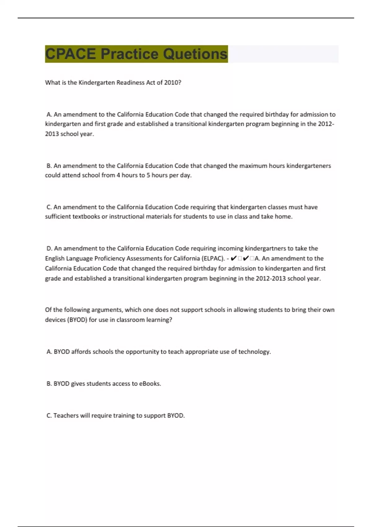 What is the Kindergarten Readiness Act of 2010? A. An amendment to the California Education Code that changed the required birthday for admission to kindergarten and first grade and established a transitional kindergarten program beginning in the school year. B. An amendment to the California Education Code that changed the maximum hours kindergarteners could attend school from 4 hours to 5 hours per day. C. An amendment to the California Education Code requiring that kindergarten classes must have sufficient textbooks or instructional materials for students to use in class and take home. D. An amendment to the California Education Code requiring incoming kindergartners to take the English Language Proficiency Assessments for California (ELPAC). - ️️A. An amendment to the California Education Code that changed the required birthday for admission to kindergarten and first grade and established a transitional kindergarten program beginning in the school year. Of the following arguments, which one does not support schools in allowing students to bring their own devices (BYOD) for use in classroom learning? A. BYOD affords schools the opportunity to teach appropriate use of technology. B. BYOD gives students access to eBooks. C. Teachers will require training to support BYOD.