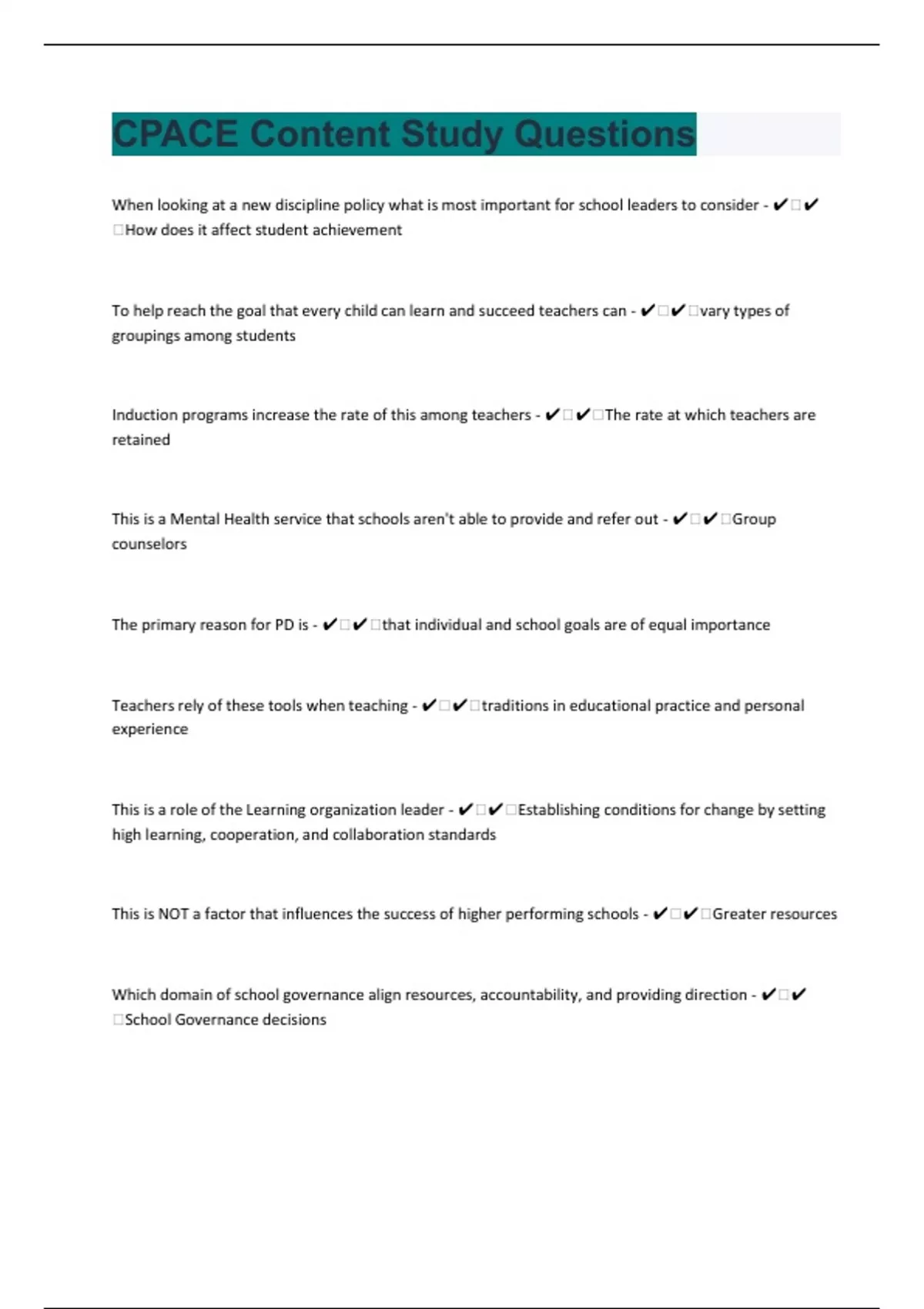 When looking at a new discipline policy what is most important for school leaders to consider - ️️How does it affect student achievement To help reach the goal that every child can learn and succeed teachers can - ️️vary types of groupings among students Induction programs increase the rate of this among teachers - ️️The rate at which teachers are retained This is a Mental Health service that schools aren't able to provide and refer out - ️️Group counselors The primary reason for PD is - ️️that individual and school goals are of equal importance Teachers rely of these tools when teaching - ️️traditions in educational practice and personal experience This is a role of the Learning organization leader - ️️Establishing conditions for change by setting high learning, cooperation, and collaboration standards This is NOT a factor that influences the success of higher performing schools - ️️Greater resources Which domain of school governance align resources, accountability, and providing direction - ️️School Governance decisions