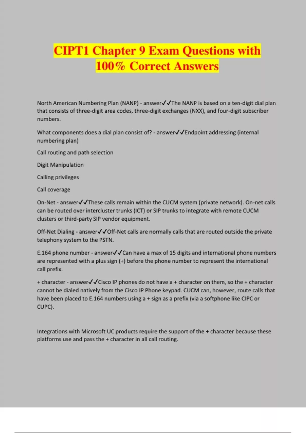 CIPT1 Chapter 9 Exam Questions with 100% Correct Answers North American Numbering Plan (NANP) - answerThe NANP is based on a ten-digit dial plan that consists of three-digit area codes, three-digit exchanges (NXX), and four-digit subscriber numbers. What components does a dial plan consist of? - answerEndpoint addressing (internal numbering plan) Call routing and path selection Digit Manipulation Calling privileges Call coverage On-Net - answerThese calls remain within the CUCM system (private network). On-net calls can be routed over intercluster trunks (ICT) or SIP trunks to integrate with remote CUCM clusters or third-party SIP vendor equipment. Off-Net Dialing - answerOff-Net calls are normally calls that are routed outside the private telephony system to the PSTN. E.164 phone number - answerCan have a max of 15 digits and international phone numbers are represented with a plus sign (+) before the phone number to represent the international call prefix. + character - answerCisco IP phones do not have a + character on them, so the + character cannot be dialed natively from the Cisco IP Phone keypad. CUCM can, however, route calls that have been placed to E.164 numbers using a + sign as a prefix (via a softphone like CIPC or CUPC). Integrations with Microsoft UC products require the support of the + character because these platforms use and pass the + character in all call routing. + dialing - answer+ dialing is supported on Cisco IP phones when calling from call lists (placed, received, and missed calls), directories, speed dials, and web-based applications like "click to dial". Intrasite routing - answerA call that is routed from one device to another device within a single site. This call is classified as an On-Net call. Intersite routing - answerA call that is routed between multiple devices that are physically located at separate geographical sites that are logically interconnected by the WAN links of the data network. The call is also classified as an On-Net call. CUMCE - answerCUCME has a dial plan that is independent of CUCM. CUCM treats CUCME as if it were an external destination reachable through the PSTN or through H.323 or SIP. Route Pattern Wildcards - answerX Single digit (0-9,*,#) @ NANP ! One or more digits (0-9,*,#) [x-y] Generic range notation [^x-y] Exclusion range notation . Terminates access code # Terminates interdigit timeout <wildcard>? Matches zero or more occurrences of any digit that matches the previous wildcard <wildcard>+ Matches one or more occurrences of any digit that matches the previous wildcard + Matches the + sign as part of a number. (The denotes a delimiter, telling CUCM to process the + as its own character, rather than the wildcard previously shown.) The + is used for globalized E.164 call routing. @ wildcard - answerThe @ wildcard is not practical for the simple reason that ut is impossible to perform a class of service (CoS) deployment without it. 9.011! - answerIn North America, the route pattern 9.011! is typically configured for international calls. # - answerThe # symbol is normally used to indicate that the system should stop analyzing the dialed digits (called party) against the call routing database and to choose the closest route immediately (even if an overlap exists in the call routing database).