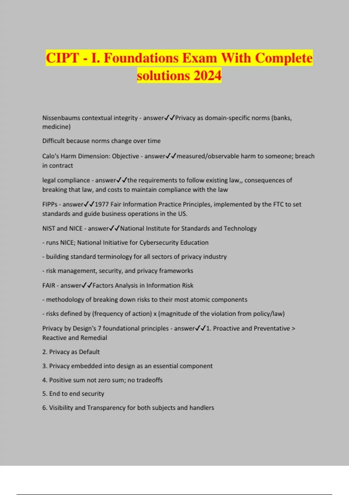 CIPT - I. Foundations Exam With Complete solutions 2024 Nissenbaums contextual integrity - answerPrivacy as domain-specific norms (banks, medicine) Difficult because norms change over time Calo's Harm Dimension: Objective - answermeasured/observable harm to someone; breach in contract legal compliance - answerthe requirements to follow existing law,, consequences of breaking that law, and costs to maintain compliance with the law FIPPs - answer1977 Fair Information Practice Principles, implemented by the FTC to set standards and guide business operations in the US. NIST and NICE - answerNational Institute for Standards and Technology - runs NICE; National Initiative for Cybersecurity Education - building standard terminology for all sectors of privacy industry - risk management, security, and privacy frameworks FAIR - answerFactors Analysis in Information Risk - methodology of breaking down risks to their most atomic components - risks defined by (frequency of action) x (magnitude of the violation from policy/law) Privacy by Design's 7 foundational principles - answer1. Proactive and Preventative > Reactive and Remedial 2. Privacy as Default 3. Privacy embedded into design as an essential component 4. Positive sum not zero sum; no tradeoffs 5. End to end security 6. Visibility and Transparency for both subjects and handlers 7. Respect for User Privacy Privacy Notice - answerconsumer-facing document indicating what the company is going to do with the consumer's informati