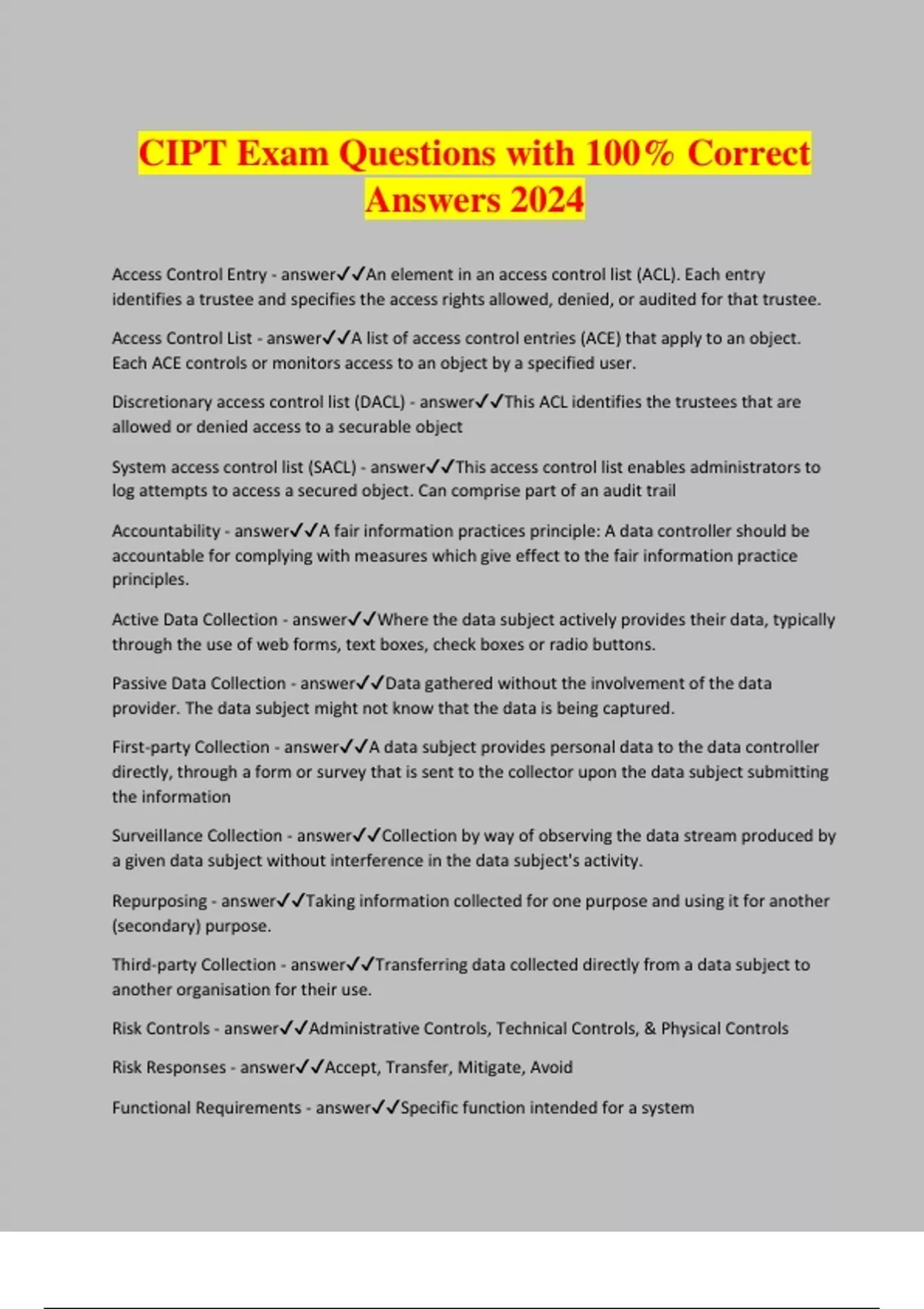 CIPT Exam Questions with 100% Correct Answers 2024 Access Control Entry - answerAn element in an access control list (ACL). Each entry identifies a trustee and specifies the access rights allowed, denied, or audited for that trustee. Access Control List - answerA list of access control entries (ACE) that apply to an object. Each ACE controls or monitors access to an object by a specified user. Discretionary access control list (DACL) - answerThis ACL identifies the trustees that are allowed or denied access to a securable object System access control list (SACL) - answerThis access control list enables administrators to log attempts to access a secured object. Can comprise part of an audit trail Accountability - answerA fair information practices principle: A data controller should be accountable for complying with measures which give effect to the fair information practice principles. Active Data Collection - answerWhere the data subject actively provides their data, typically through the use of web forms, text boxes, check boxes or radio buttons. Passive Data Collection - answerData gathered without the involvement of the data provider. The data subject might not know that the data is being captured. First-party Collection - answerA data subject provides personal data to the data controller directly, through a form or survey that is sent to the collector upon the data subject submitting the information Surveillance Collection - answerCollection by way of observing the data stream produced by a given data subject without interference in the data subject's activity. Repurposing - answerTaking information collected for one purpose and using it for another (secondary) purpose. Third-party Collection - answerTransferring data collected directly from a data subject to another organisation for their use. Risk Controls - answerAdministrative Controls, Technical Controls, & Physical Controls Risk Responses - answerAccept, Transfer, Mitigate, Avoid Functional Requirements - answerSpecific function intended for a system Types of data collection - answer- First party - Surveillance - Repurposing - Third party Nonfunctional Requirements - answerA requirement that specifies criteria that can be used to judge the operation of a system, rather than specific behaviours. Legal Standards - answerNonfunctional requirements or properties that cut across a system's design and functionality Legal Rules - answerSpecific steps to comply with privacy law Childrens Online Privacy Protection Act - COPPA - answerObtain verifiable parental consent before any collection, use, and/or disclosure of personal information from children under 13 Fingerprinting - answer K-Annoynominity - answer"... data with scientific guarantees that the individuals who are the subjects of the data cannot be re-identified while the data remain practically useful." A release of data is said to have the k-anonymity property if the information for each person contained in the release cannot be distinguished from at least k - 1 individuals whose information also appear in the release. Authentication - answer- What you know - What you have - Where you are - What you are AdChoices - answerDigital Advertising Alliance program to promote awareness and choice in advertising for internet users. DAA member websites have AdChoices icon near ads or at the bottom of their pages for users to set preferences for behavioral advertising on that website. Adequate Level of Protection - answerA label that the EU may apply to third-party countries who have committed to protect data through domestic law making or international commitments. Conferring of the label requires a proposal by the European Commission, an Article 29 Working Group Opinion, an opinion of the article 31 Management Committee, a right of scrutiny by the European Parliament and adoption by the European Commission. Advanced Encryption Standard (AES) - answerType of symmetric encryption. An encryption algorithm for security sensitive non-classified material by the U.S. Government. In 2001 to replace the previous algorithm, the Date Encryption Standard (DES). Adverse Action - answerUnder the Fair Credit Reporting Act, the term "adverse action" is defined very broadly to include all business, credit and employment actions affecting consumers that can be considered to have a negative impact, such as denying or canceling credit or insurance, or denying employment or promotion. No adverse action occurs in a credit transaction where the creditor makes a counteroffer that is accepted by the consumer. Such an action requires that the decision maker furnish the recipient of the adverse action with a copy of the credit report leading to the adverse action. Agile Development Model - answerA process of software system and product design that incorporates new system requirements during the actual creation of the system, as opposed to the Plan-Driven Development Model. Anonymization - answerIndividually identifiable data is altered in such a way that it no longer can be related back to a given individual. Suppression - answerType of anonymization removes some identifying values from data to reduce its identifiability. Generalization - answerType of anonymization takes specific identifying values and makes them broader, such as changing a specific age (18) to an age range (18-24). Noise addition - answerType of anonymization takes identifying values from a given data set and switches them with identifying values from another individual in that data set. Note that all of these processes will not guarantee that data is no longer identifiable and have to be performed in such a way that does not harm the usability of the data. Anonymous Data - answerData sets that in no way indicate to whom the data belongs. Antidiscrimination Laws - answerRefers to the right of people to be treated equally. Application-Layer Attacks - answerAttacks that exploit flaws in the network applications installed on network servers. Such