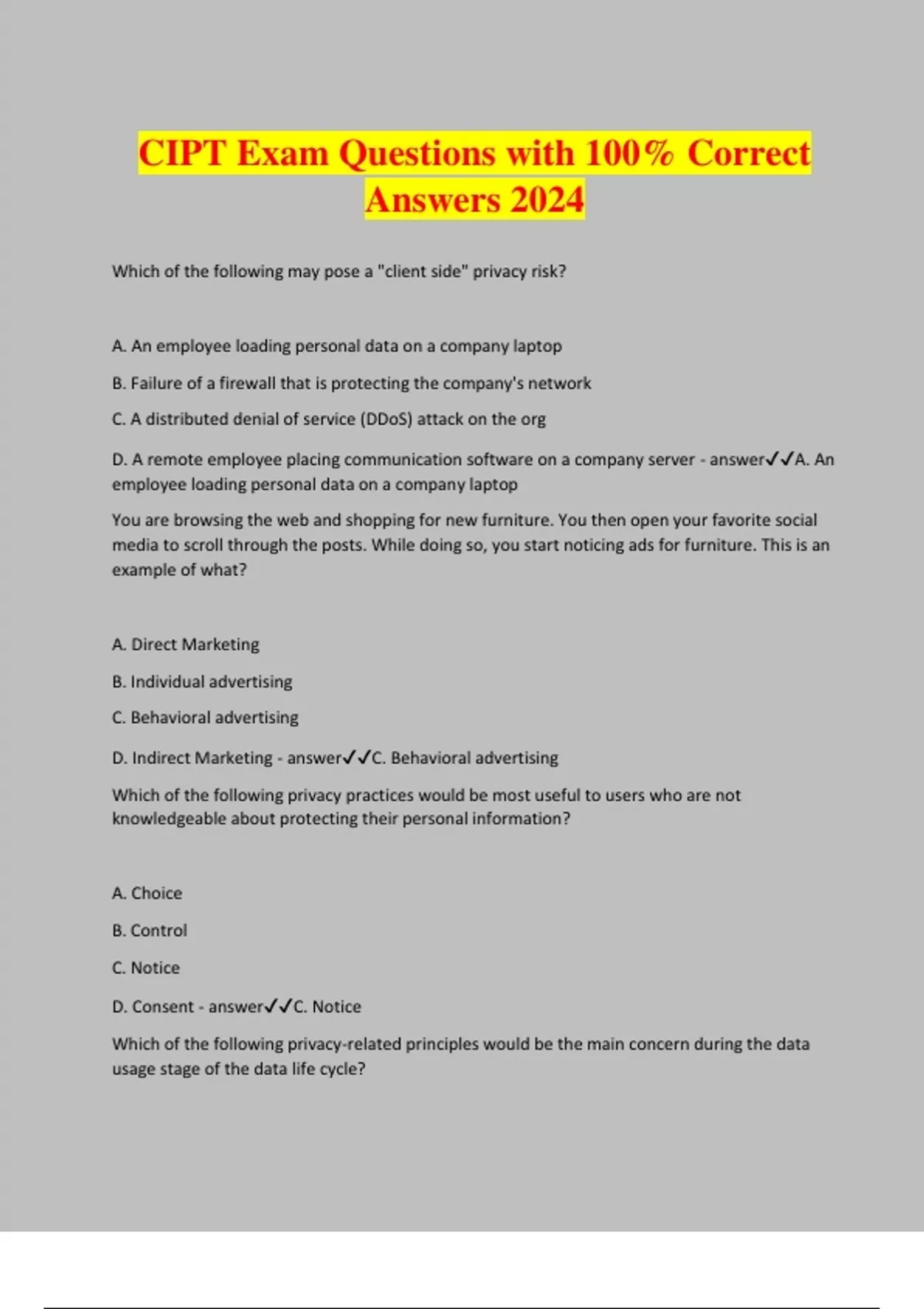 CIPT Exam Questions with 100% Correct Answers 2024 Which of the following may pose a "client side" privacy risk? A. An employee loading personal data on a company laptop B. Failure of a firewall that is protecting the company's network C. A distributed denial of service (DDoS) attack on the org D. A remote employee placing communication software on a company server - answerA. An employee loading personal data on a company laptop You are browsing the web and shopping for new furniture. You then open your favorite social media to scroll through the posts. While doing so, you start noticing ads for furniture. This is an example of what? A. Direct Marketing B. Individual advertising C. Behavioral advertising D. Indirect Marketing - answerC. Behavioral advertising Which of the following privacy practices would be most useful to users who are not knowledgeable about protecting their personal information? A. Choice B. Control C. Notice D. Consent - answerC. Notice Which of the following privacy-related principles would be the main concern during the data usage stage of the data life cycle? A. Transparency B. Data Minimization C. Storage Limitation D. Purpose Limitation - answerD. Purpose Limitation Under the EU's General Data Protection Regulation (GDPR), which of the following types of information would NOT require notification to a supervisory authority in the event of a personal data breach? A. Pseudonymized data B. Anonymized data C. Reidentified data D. Deidentified data - answerB. Anonymized data Authentication can be accomplished by a variety of mechanisms. Which are the four main categories? A. What you know, when you know, where you are, what you are B. What you know, what you have, when you know, where you are C. What you know, what you have, where you are, what you are D. What you know, what you have, where you are, when you know - answerC. What you know, what you have, where you are, what you are The acronym PGP stands for: - answerPretty Good Privacy Julie needs to securely transfer a file containing personal data to Katelyn. They decide to use asymmetric encryption. What are the correct steps they should follow? - answerJulie encrypts the file using Katelyn's public key, Katelyn decrypts using her private key When purchasing a product from TripeType's website, a customer must enter basic information into a purchase form. A link to TripeType's privacy statement is provided on the purchase form. However, it does not disclose that it will use personal information for other purposes. The statement provides that TT will store the customer information in its database. A month later, TT's sales team wants to generate new leads and decides to use the information collected from customers. This is an example of what? A. Secondary Use B. Involuntary use C. Disapproved Use D. Selective Use - answerA. Secondary Use Which of the following explains why it is difficult to regulate what individually identifiable data is? A. Many people mistakenly expose personal information online B. Personal information means different things to different people C. Most legislative bodies are hesitant to enact laws about identifiable data D. Data that is not overly identifiable can be combined to identify individuals - answerD. Data that is not overly identifiable can be combined to identify individuals Ubiquitous computing can raise significant concerns about the sheer volume of data that can be collected by a system. Each of the following are necessary considerations when utilizing a data collection process that falls into this category EXCEPT which? A. The system should provide end-users with both feedback and control B. The system should have obvious value C. The retention of data by the system should be limited D. The data collected by system should be aggregated and made available to all users - answerD. The data collected by system should be aggregated and made available to all users In creating a registration form for a mobile app directed at grade school children, what privacy engineering objective is addressed by asking for grade level instead of data of birth? A. Disassociability B. Manageability C. Security D. Predictability - answerA. Disassociability Which of the following is NOT an example of automated decision making? A. Receiving an answer to a support question utilizing a chat bot B. Obtaining approval for insurance through an online application C. Requesting an emailed catalog from an online retailer D. Setting airfare based on browser history and date of purchase - answerC. Requesting an emailed catalog from an online retailer Which of the following circumstances would best be addressed by utilizing radio frequency identification (RFID) technology? A. An org has a high error rate for entering credit card data into POS system B. An org requires two-way communication between its discoverable devices C. An org needs to develop an encryption-supported network D. An org's inventory process is taking too long - answerD. An org's inventory process is taking too long What type of interference occurs when false or inaccurate information on a credit application results in denial of credit? A. Decisional B. Intrusion C. Disclosure D. Appropriation - answerA. Decisional Which of the following is an objective for privacy engineering? A. Encryption B. Anonymization C. Manageability D. Audit - answerC. Manageability Which of the following technologies allows individuals to participate in a salary survey without revealing the specific salary or per