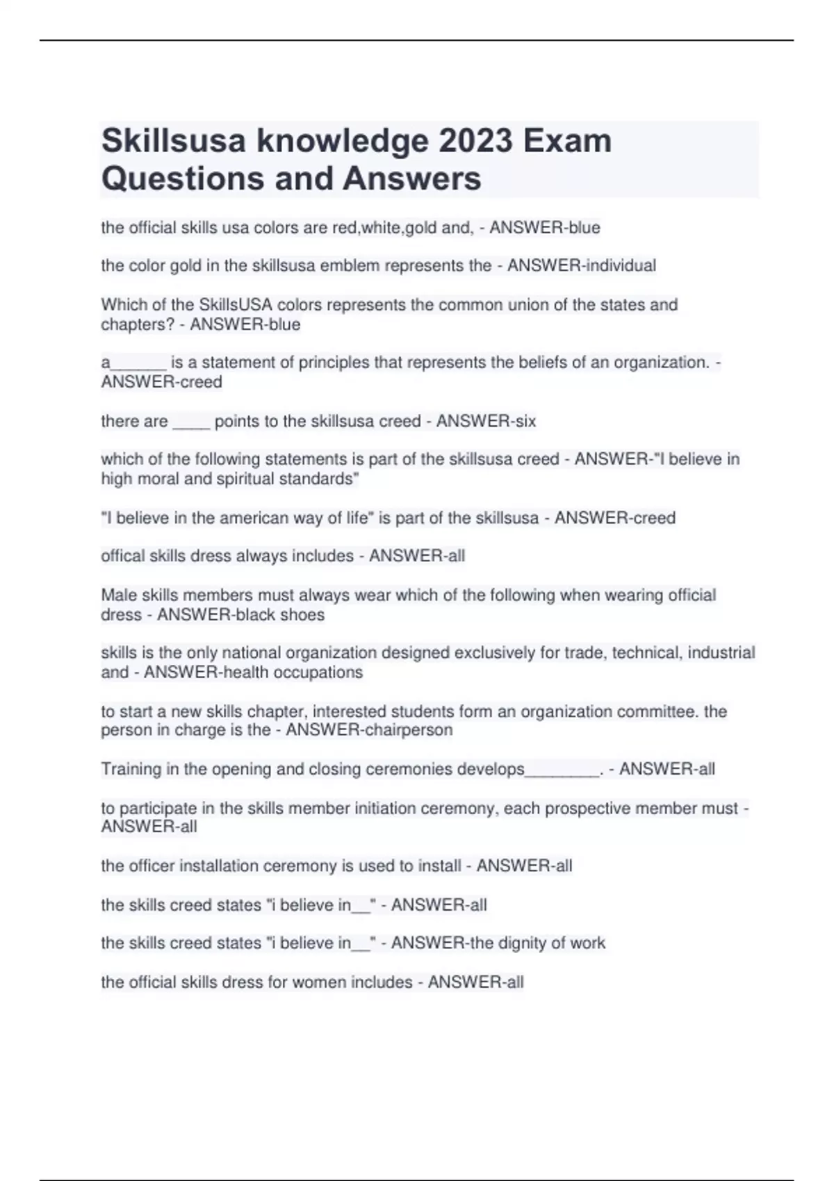 the official skills usa colors are red,white,gold and, - ANSWER-blue the color gold in the skillsusa emblem represents the - ANSWER-individual Which of the SkillsUSA colors represents the common union of the states and chapters? - ANSWER-blue a______ is a statement of principles that represents the beliefs of an organization. - ANSWER-creed there are ____ points to the skillsusa creed - ANSWER-six which of the following statements is part of the skillsusa creed - ANSWER-"I believe in high moral and spiritual standards" "I believe in the american way of life" is part of the skillsusa - ANSWER-creed offical skills dress always includes - ANSWER-all Male skills members must always wear which of the following when wearing official dress - ANSWER-black shoes skills is the only national organization designed exclusively for trade, technical, industrial and - ANSWER-health occupations to start a new skills chapter, interested students form an organization committee. the person in charge is the - ANSWER-chairperson Training in the opening and closing ceremonies develops________. - ANSWER-all to participate in the skills member initiation ce