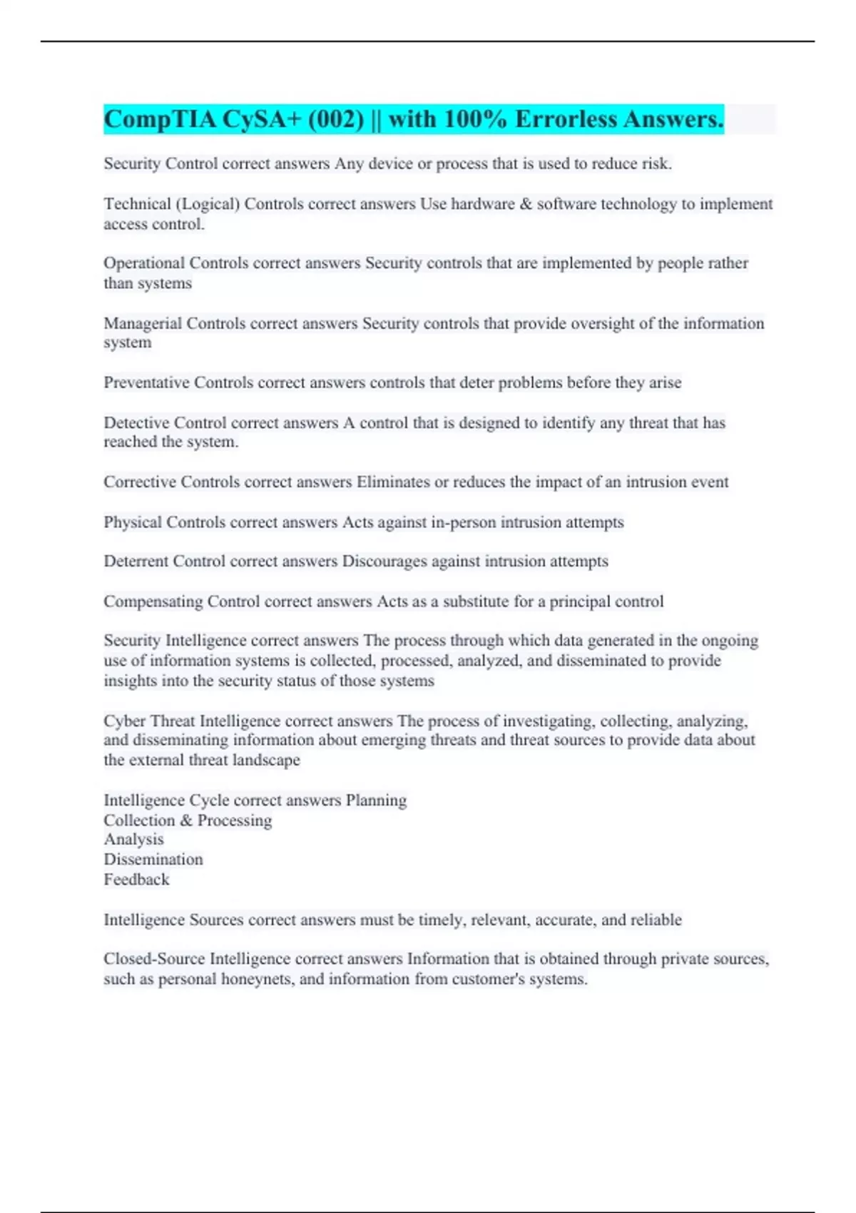 Security Control correct answers Any device or process that is used to reduce risk. Technical (Logical) Controls correct answers Use hardware & software technology to implement access control. Operational Controls correct answers Security controls that are implemented by people rather than systems Managerial Controls correct answers Security controls that provide oversight of the information system Preventative Controls correct answers controls that deter problems before they arise Detective Control correct answers A control that is designed to identify any threat that has reached the system. Corrective Controls correct answers Eliminates or reduces the impact of an intrusion event Physical Controls correct answers Acts against in-person intrusion attempts Deterrent Control correct answers Discourages against intrusion attempts Compensating Control correct answers Acts as a substitute for a principal control Security Intelligence correct answers The process through which data generated in the ongoing use of information systems is collected, processed, analyzed, and disseminated to provide insights into the security status of those systems Cyber Threat Intelligence correct answers The process of investigating, collecting, analyzing, and disseminating information about emerging threats and threat sources to provide data about the external threat landscape Intelligence Cycle correct answers Planning Collection & Processing Analysis Dissemination Feedback Intelligence Sources correct answers must be timely, relevant, accurate, and reliable Closed-Source Intelligence correct answers Information that is obtained through private sources, such as personal honeynets, and information from customer's systems.