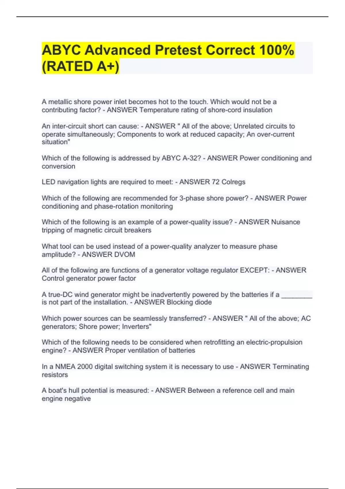 ABYC Advanced Pretest Correct 100%(RATED A+)