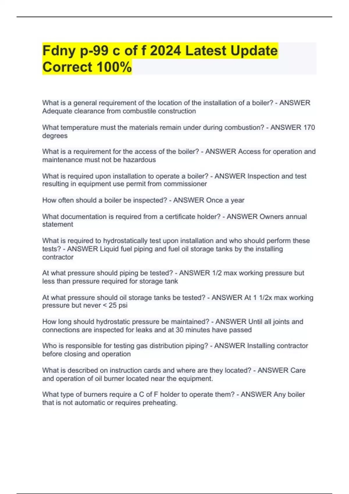 What is a general requirement of the location of the installation of a boiler? - ANSWER Adequate clearance from combustile construction What temperature must the materials remain under during combustion? - ANSWER 170 degrees What is a requirement for the access of the boiler? - ANSWER Access for operation and maintenance must not be hazardous What is required upon installation to operate a boiler? - ANSWER Inspection and test resulting in equipment use permit from commissioner How often should a boiler be inspected? - ANSWER Once a year What documentation is required from a certificate holder? - ANSWER Owners annual statement What is required to hydrostatically test upon installation and who should perform these tests? - ANSWER Liquid fuel piping and fuel oil storage tanks by the installing contractor At what pressure should piping be tested? - ANSWER 1/2 max working pressure but less than pressure required for storage tank At what pressure should oil storage tanks be tested? - ANSWER At 1 1/2x max working pressure but never < 25 psi How long should hydrostatic pressure be maintained? - ANSWER Until all joints and connections are inspected for leaks and at 30 minutes have passed Who is responsible for testing gas distribution piping? - ANSWER Installing contractor before closing and operation What is described on instruction cards and where are they located? - ANSWER Care and operation of oil burner located near the equipment. What type of burners require a C of F holder to operate them? - ANSWER Any boiler that is not automatic or requires preheating. What is the license holder responsible for after repair? - ANSWER Inspecting the repairs, and functioning of all control devices and positioning of valves. What type of heat and combustion equipment are required with the air pollution control code? - ANSWER All burners fire with solid, liquid, or gas. Including rubbish burners/incinerators. What temperature are the products of combustion upon exit in low temperature equipment? - ANSWER Less than 600 degrees What temperature are the products of combustion upon exit in medium temperature equipment? - ANSWER 6001000 What temperature are the products of combustion upon exit in high temperature equipment? - ANSWER 1000+ How much cfm of air be capable of per gallon of oil per hour? - ANSWER 36 cfm