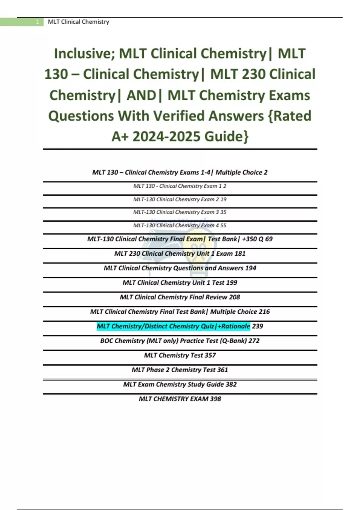 Inclusive; MLT Clinical Chemistry| MLT 130 – Clinical Chemistry| MLT 230 Clinical Chemistry| AND| MLT Chemistry Exams Questions With Verified Answers {Rated A+ Guide} MLT 130 – Clinical Chemistry Exams 1-4| Multiple Choice 2 MLT 130 - Clinical Chemistry Exam 1 2 MLT-130 Clinical Chemistry Exam 2 19 MLT-130 Clinical Chemistry Exam 3 35 MLT-130 Clinical Chemistry Exam 4 55 MLT-130 Clinical Chemistry Final Exam| Test Bank| +350 Q 69 MLT 230 Clinical Chemistry Unit 1 Exam 181 MLT Clinical Chemistry Questions and Answers 194 MLT Clinical Chemistry Unit 1 Test 199 MLT Clinical Chemistry Final Review 208 MLT Clinical Chemistry Final Test Bank| Multiple Choice 216 MLT Chemistry/Distinct Chemistry Quiz|+Rationale 239 BOC Chemistry (MLT only) Practice Test (Q-Bank) 272 MLT Chemistry Test 357 MLT Phase 2 Chemistry Test 361 MLT Exam Chemistry Study Guide 382 MLT CHEMISTRY EXAM 398