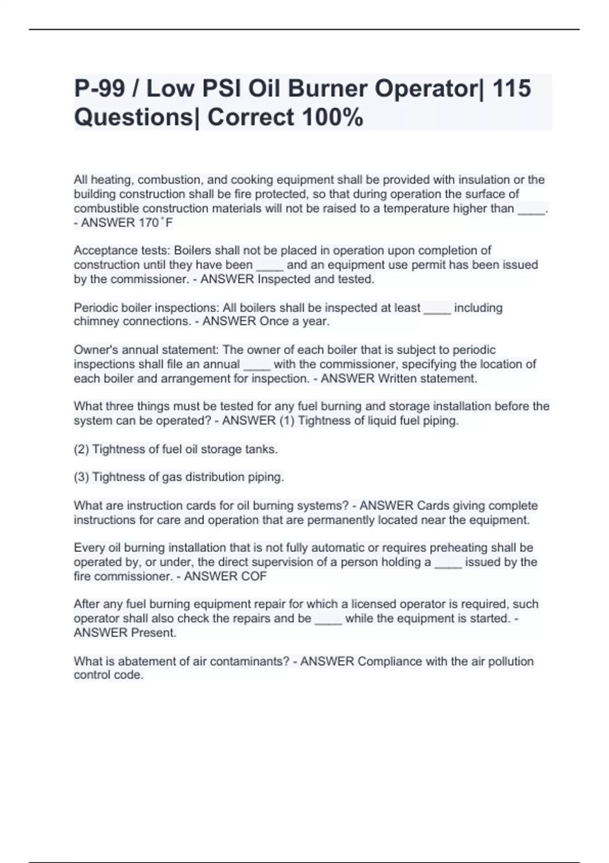 P-99 / Low PSI Oil Burner Operator| 115 Questions| Correct 100%