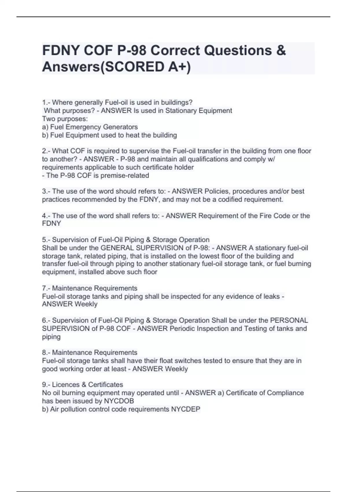 1.- Where generally Fuel-oil is used in buildings? What purposes? - ANSWER Is used in Stationary Equipment Two purposes: a) Fuel Emergency Generators b) Fuel Equipment used to heat the building 2.- What COF is required to supervise the Fuel-oil transfer in the building from one floor to another? - ANSWER - P-98 and maintain all qualifications and comply w/ requirements applicable to such certificate holder - The P-98 COF is premise-related 3.- The use of the word should refers to: - ANSWER Policies, procedures and/or best practices recommended by the FDNY, and may not be a codified requirement. 4.- The use of the word shall refers to: - ANSWER Requirement of the Fire Code or the FDNY 5.- Supervision of Fuel-Oil Piping & Storage Operation Shall be under the GENERAL SUPERVISION of P-98: - ANSWER A stationary fuel-oil storage tank, related piping, that is installed on the lowest floor of the building and transfer fuel-oil through piping to another stationary fuel-oil storage tank, or fuel burning equipment, installed above such floor 7.- Maintenance Requirements Fuel-oil storage tanks and piping shall be inspected for any evidence of leaks - ANSWER Weekly 6.- Supervision of Fuel-Oil Piping & Storage Operation Shall be under the PERSONAL SUPERVISION of P-98 COF - ANSWER Periodic Inspection and Testing of tanks and piping 8.- Maintenance Requirements Fuel-oil storage tanks shall have their float switches tested to ensure that they are in good working order at least - ANSWER Weekly 9.- Licences & Certificates No oil burning equipment may operated until - ANSWER a) Certificate of Compliance has been issued by NYCDOB b) Air pollution control code requirements NYCDEP c) Permit for the Storage & use of fuel-oil issued by FDNY 10.- Licences & Certificates Pursuant to the New NYC Fire Code & Mechanical Codes stated that - ANSWER The COF is required for all existing and new buildings where fuel is being transported from the lowest levels to tanks or equipment on upper floors 11.- Oil Circulation in the System Diagram #1 - ANSWER The process of oil circulation from the tank at the lowest floor of a building to the burner on the floor above such floor through the pump. 12.- Oil Circulation in the System Oil storage tank - ANSWER Provides the supply of oil for combustion in the oil burner. It is inside a dike. In case of a leak the diked area will contain the oil. In its normal condition, #2 fuel-oil is thin and light and is easily pumped through the circulation system 13.- Oil Circulation in the System A Suction pump - ANSWER Circulates the oil throughout the system. Dirt and sediment are present in the fuel-oil coming from the oil storage tank. The oil filter removes most of these contaminants from the oil before the oil reaches the burner's strainer. 14.- Oil Circulation in the System The Suction Line - ANSWER Has to be 6 inches from the bottom of the tank for sediments not to be absorbed. The vacuum gauge is a device that measures pressure below atmospheric pressure. Excessive vacuum readings indicate that there is an obstruction in the suction line (such as dirty oil strainer). When this occurs the flow of oil can be stopped by closing the shut-off valve. This permits the operator to clean the filter/strainer or to perform other maintenance 15.- Oil Circulation in the System Main Fuel Valve - ANSWER Electrically operated and will open or close the line leading to the atomizer only for oil burners. It will shut down the burner system if there is a failure of ignition or combustion. 16.- Oil Circulation in the System A Back Pressure Relief Valve - ANSWER Oil circulates through the piping system back to the storage tank through the oil return line. A back pressure relief valve is provided for safety if the pressure becomes too great. Day tanks may be located throughout the building above the lowest floor 17.- Oil Circulation in the System A Separate Pump - ANSWER Required for each day tank to supply each floor. In case of a leak in the piping, leak collector is provided. Leak collector is stored by the storage tank. It has a oil level gauge which shows the amount collected 18.- Oil Circulation in the System Level Gauge - ANSWER A gauge will show how much fuel oil is inside a main storage tank/day tank. 19.- Oil Burner Operation Combustion - ANSWER Is the chemical union of the oxygen in the air with combustible elements in fuel-oil (hydrogen and carbon). The end result of this process is the production of heat energy 20.- Oil Burner Operation Oil Firing Equipment - ANSWER Used to liberate heat energy from fuel-oil. Oil burners are the principal components of the oil firing equipment and provide the means of supporting the process of combustion. 21.- Oil Burner Operation Two principal elements of fuel-oil - ANSWER Carbon and hydrogen. During the combustion process, the carbon content of fuel-oil (about 85%) unites with the oxygen in the air and forms carbon dioxide and carbon monoxide. The hydrogen content of the oil (about 14%) unites with the oxygen and produces water. The objective is to have a complete combustion process 22.- Oil Burner Operation In order to support combustion - ANSWER It must be changed to a gas or vapor and mixed with air 23.- Oil Burner Operation The Oil burner - ANSWER Primarily a device for processing the liquid fuel for combustion by accelerating the change from liquid to a vapor that can be mixed with air and burned. 24.- Oil Burner Operation Atomizing Oil - ANSWER This process of breaking down or atomizing the oil is to ensure prompt ignition and rapid combustion. Although there are various types of oil burners, i.e. generator or boiler, they all vaporize or atomize the oil before it enters the combustion chamber where it is mixed with air in predetermined proportions. 25.- Oil Burner Operation Oil burner uses an Oil Pump - ANSWER Mixes air and oil within the nozzle itself. In oil burners, the oil and air mixture is delivered to the nozzle at a pressure dependent upon the ma